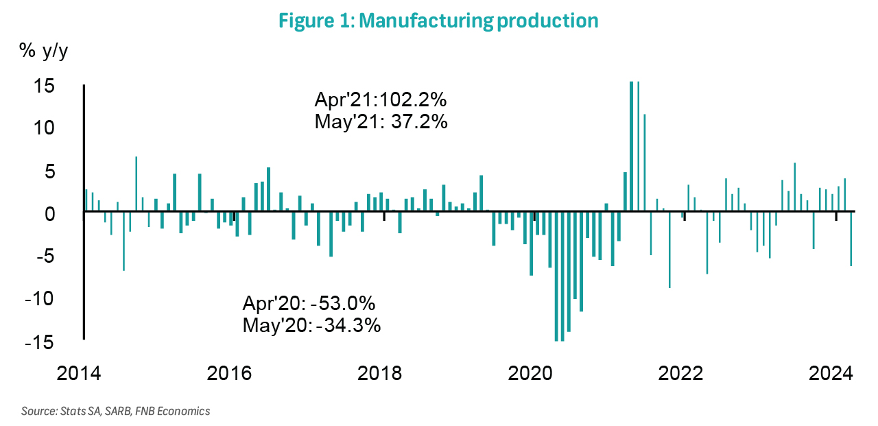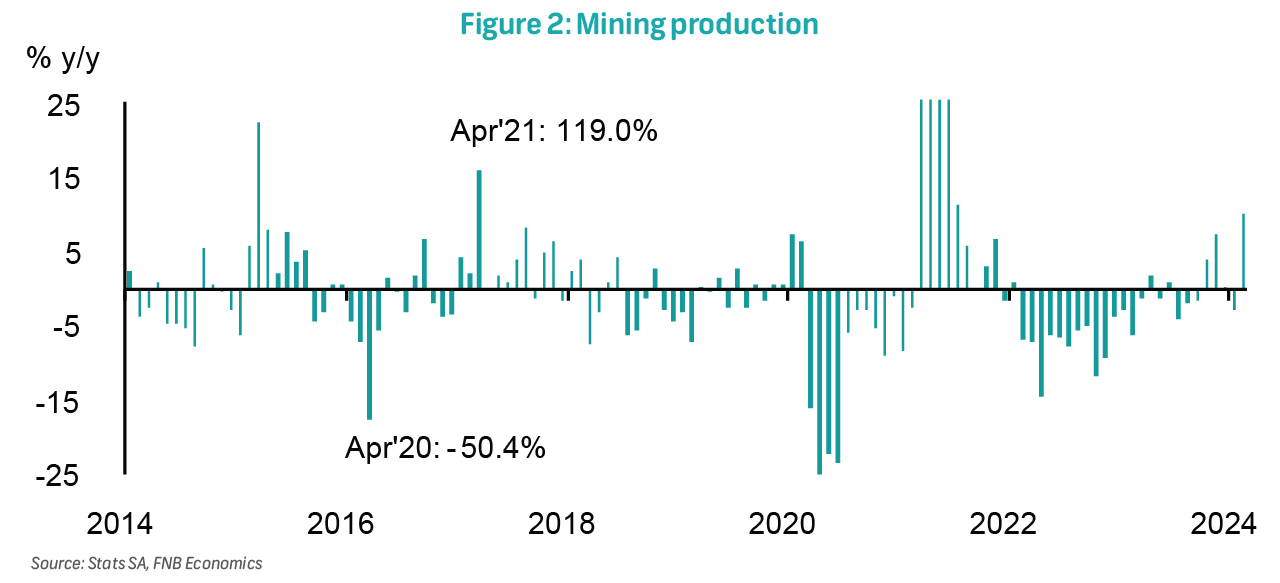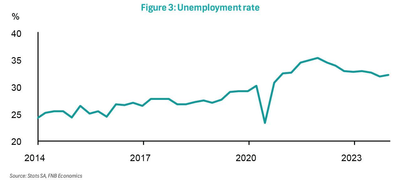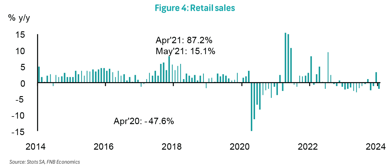 Also on Tuesday, the Quarterly Labour Force Survey (QLFS) for 1Q24 will be published. In 4Q23, the QLFS revealed that the official unemployment rate rose to 32.1% from 31.9% in 3Q23. This reflected a quarterly decline in employment of 21 587, bringing the total number of employed individuals to 16 723 195, meanwhile unemployment increased by 46 304 to reach 7 895 434. The largest decline in employment was observed in the community and social services sector, shedding 170 768 jobs. The primary sectors, construction sector, as well as wholesale and retail trade, motor trade, hotels, and restaurants, all experienced job losses in the fourth quarter.