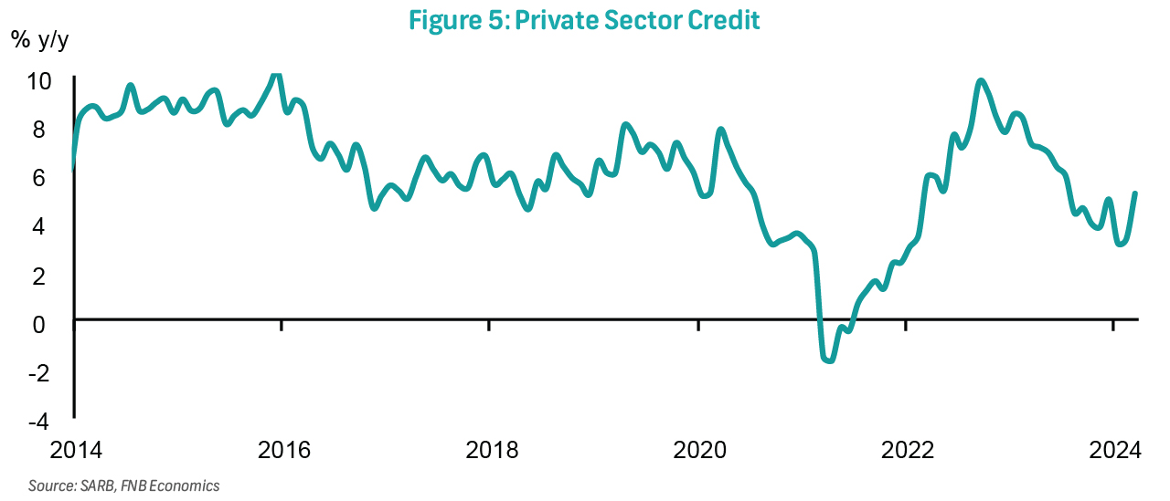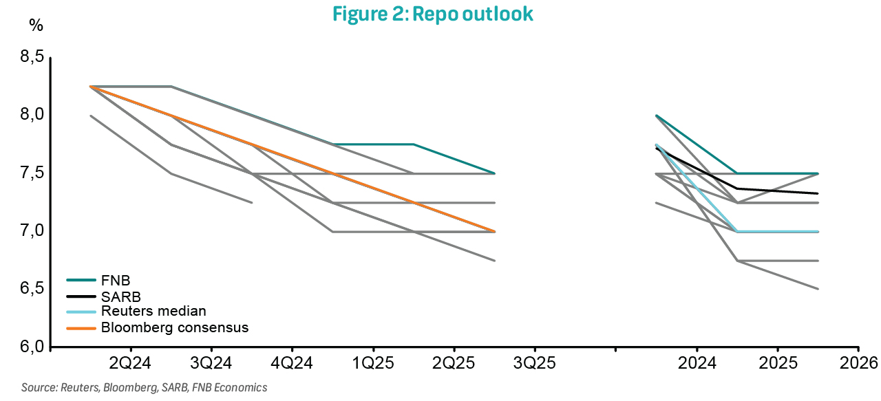 The consensus expectation is for the first cut to be delivered in 3Q24, with a cumulative 50bps worth of cuts by year-end. We anticipate a 25bps cut in November, while some analysts see the possibility of no cuts this year. By the end of 2026, most analysts foresee a 7% repo rate, but we, along with a few others, currently predict 7.5%. A stickier interest rate path provisions for a change in the SARB's reaction function, as they pursue a lower inflation target. Ultimately, it remains in line with the "higher-for-longer" theme.