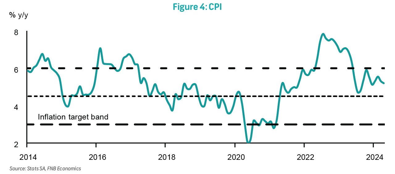 Headline inflation softened to 5.2% in April from 5.3% in March, with monthly pressure of 0.3%. Driving the monthly pressure was core and fuel inflation. Core inflation lifted by 0.2% m/m and 4.6% y/y, primarily driven by alcoholic beverages and tobacco. Fuel increased by 1.9% m/m and 9.0% y/y, while food and NAB inflation continued to slow, settling at 4.7% y/y from 5.1% previously. We expect monthly pressure on headline inflation to ease further in May and annual inflation to remain unchanged. Beyond May, core inflation should stabilise, fuel price dynamics should be more positive, but food inflation should reflect some upward pressure from adverse weather conditions. Average annual headline inflation should be north of 5% for 2024.