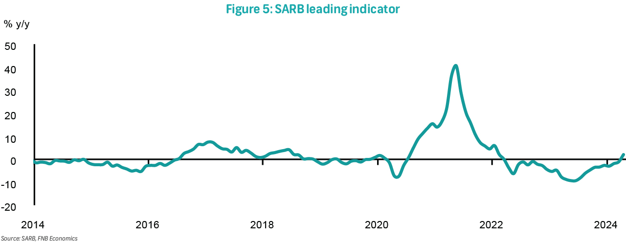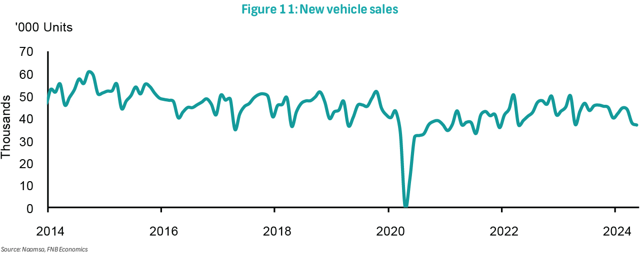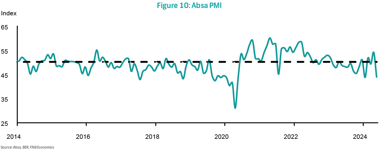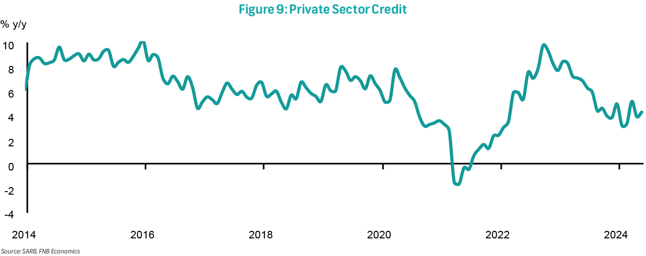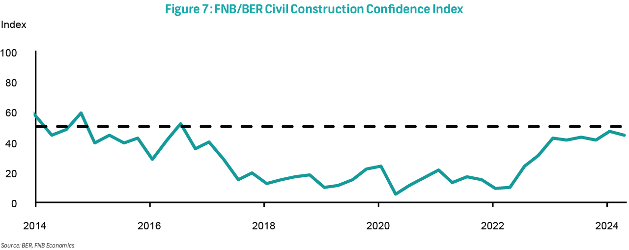The FNB/BER Civil Confidence Index fell to 44 index points in 2Q24, from a near eight-year peak of 47 points in 1Q24. This highlighted slowing activity in the sector as well as uncertainty ahead of the elections. Nevertheless, confidence was still above the sample average of 41 points (since 1997) and activity is expected to improve going forward. This will be further supported by reduced political uncertainty and demand related to energy and other infrastructure projects.