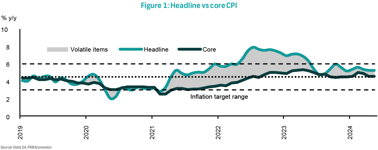 Starting with the focal point. Headline consumer inflation recorded an average of 3.3% in 2020, the lowest since 2004, before post-lockdown supply-demand imbalances and geopolitical tensions drove inflation to 6.9% in 2022. Following a peak of 7.8% in July 2022, base-effects supported inflation as low as 4.7% in July 2023, but it has since stabilised above 5% - settling at 5.2% in April and May of this year. The impact of restrictive monetary policy has been key, limiting the lift in underlying (core) pressures which peaked at 5.3% in April 2023. Another supportive development in core inflation was that average core goods inflation was faster than services inflation. Core goods inflation reflected global developments more immediately, while firms delayed the passthrough to services. Had these measures lifted in tandem, headline inflation would have been more pronounced and interest rates more cumbersome.