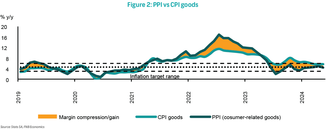 Generally, weaker passthrough during the 2022 price shock was also evident in Producer Price Index (PPI) dynamics where price pressures on goods were not fully reflected in consumer goods. During that year, producer inflation peaked at 18.0% in July, with a proxy for consumer-related PPI peaking at 16.9%, each at least five percentage points above the peak in CPI goods inflation. On average, producer inflation was 14.3%, with consumer-related PPI averaging 12.9%, whereas CPI goods inflation was 9.8%. While our analysis reflects a one-way causality from producer inflation, with the passthrough occurring within one to three months, the extent was limited. This implies that retailers experienced margin pressures, given weak consumer fundamentals as a cost-of-living crisis began amid depleting lockdown-related involuntary savings. Since April 2023, producer inflation has been running marginally below consumer goods inflation as retailers attempt to gradually claw back some of the losses observed in 2022. The latest producer inflation print for May was 4.6% y/y, reflecting a moderation from 5.1% in April. Excluding petroleum-related goods, producer inflation was 3.9% down from 4.5% over the same period. Meanwhile, consumer-related PPI was 4.3% and CPI goods recorded 5.7%. 1 Data is reported on a year-on-year basis unless it is stated otherwise.