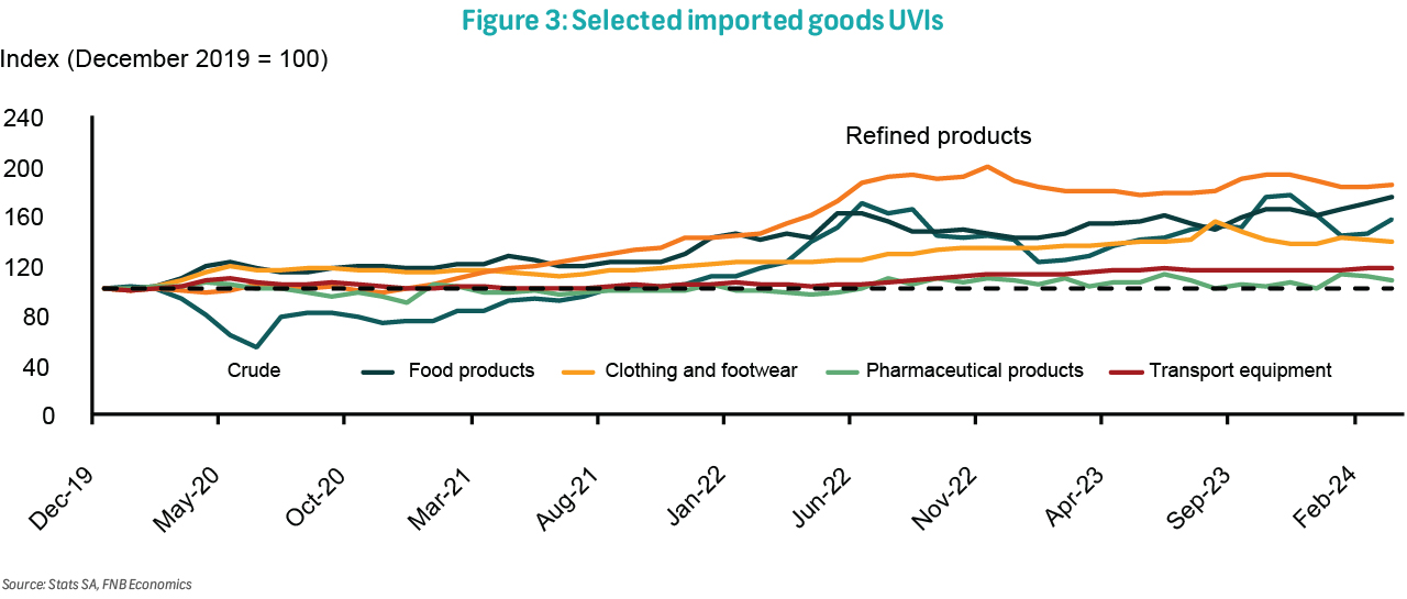 The Unit Value Indices (UVI) are another proxy of price pressures, providing indications of how imported unit values are changing. These should filter through to producer and consumer costs. Indexing the unit values to the end of 2019 shows how imported cost pressures lifted markedly across consumer-related products in 2022, led by crude and refined products, food products, and recently joined by clothing and footwear. Although the UVIs for these items remained elevated in April, lower petroleum product prices and a less depreciated rand should support an easing going forward.