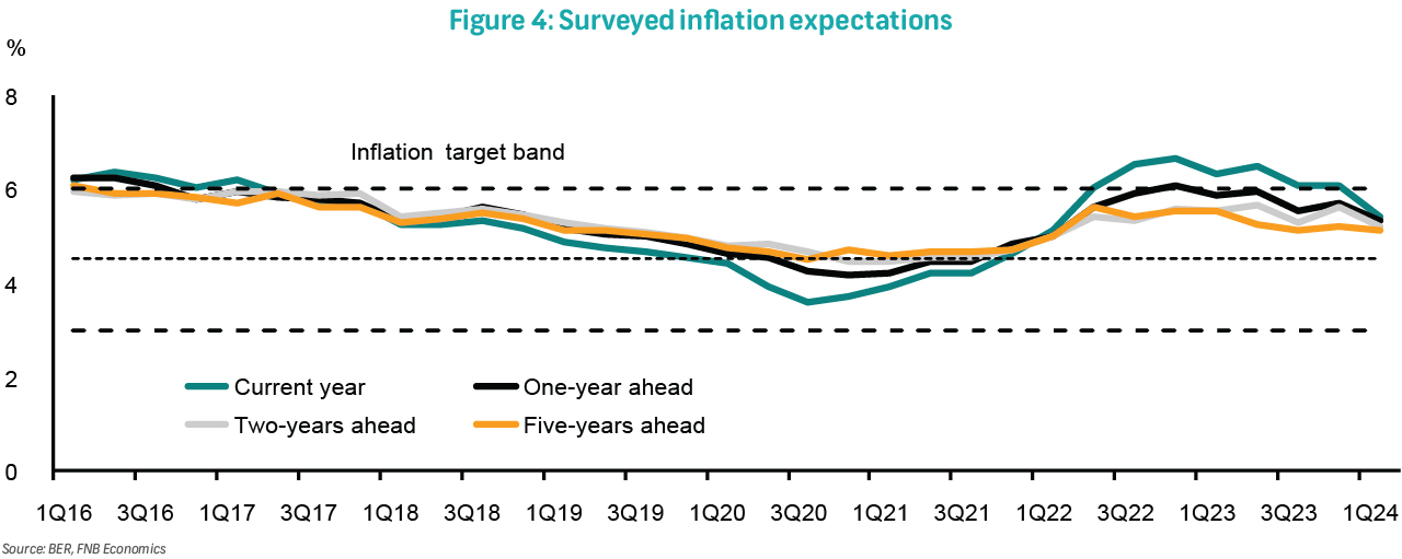 Overall, this data points to inflation being faster than the central bank prefers. However, pressures are subsiding, and a less depreciated rand as well as easing structural constraints such as load-shedding, should be supportive of slower inflation. We currently project inflation to slow towards 4.5% before year-end and more sustainably over the medium term. 2 The survey is published by the BER and covers business, trade unions and analysts.