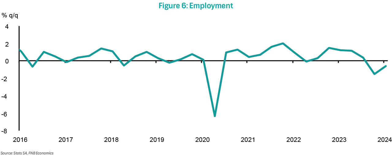 Employment in the formal non-agricultural sectors of the economy, as reflected in the Quarterly Employment Survey, contracted by over 60 000 jobs or -0.6% q/q in 1Q24. Many of the jobs shed were in trade and it was more than just post-festive layoffs of part-time workers. Compared to 1Q23, 70 000 jobs (0.6%) have been lost but over 400 000 jobs have been added since 1Q19. The latest estimates reflect 10.7 million workers in the formal economy. Total gross earnings declined by 3.5% q/q but were 4.8% higher than in 1Q23. Notably, earnings were 36.8% higher than 1Q19 levels, beating inflation of 28.4%. South Africa's political landscape remains uncertain, but joblessness should be top of mind as the seventh administration is formalised. Continued progress in structural reform and improved local growth over the medium term is paramount to employment creation. Furthermore, as inflation subsides over the next year, profitability and spending power should improve. Ultimately, after two years of cost-of-living pressures, jobs and income would be the most meaningful relief to households.