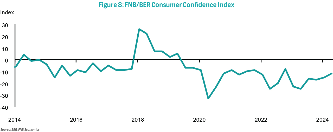 The FNB/BER Consumer Confidence Index (CCI) continued to improve in 2Q24. The CCI lifted to -12 index points in 2Q24, after improving to -15 points in 1Q24 from -17 points in 4Q23. This was the highest reading in 18 months, reflecting load-shedding reprieve and lower cost-of-living pressures. While the survey was conducted after the national elections, it was before the proposed GNU and was likely still hindered by political uncertainty to some degree. In line with this, lower-income consumers, who are more sensitive to cost pressures, had improved confidence. Meanwhile, higher-income earners, who are more sensitive to structural and policy issues, showed no improvement in sentiment. Ultimately, the reading still suggests broad pessimism, highlighting that while consumers perceive their financial outlook as more positive, they remain concerned about the overall performance of the economy which will hinder their willingness to purchase durable goods.