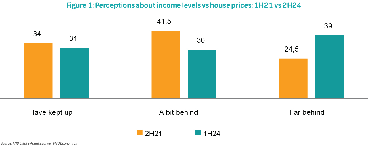 The survey reveals a significant increase in the number of real estate agents who believe that incomes have not kept pace with house prices. Since the start of the interest rate hiking cycle in 2H21, the proportion of agents reporting incomes to have fallen “far behind” house prices has surged from 24.5%, to 39% in 1H24 (Figure 1). This highlights the growing disparity between what people earn and what they need to pay for housing, amid elevated debt-service costs. Consequently, mortgage volumes have fallen below pre-pandemic levels, reflecting the difficulty many South Africans face in securing financing, especially first-time buyers.