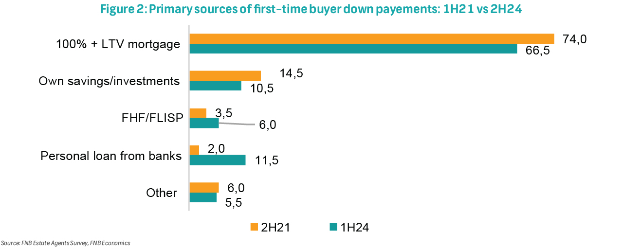To bridge the affordability gap, first-time buyers are increasingly turning to unsecured bank loans and government subsidies. According to the survey, the reliance on unsecured loans, which come with higher interest rates and shorter repayment terms, has risen sharply from 2% in 2H21 to 11.5% in 1H24. This indicates that first-time buyers are taking on more financial risk to enter the market. Government subsidies, like the First Home Finance (FHF), formerly known as the Finance Linked Individual Subsidy Program (FLISP), are also playing a more critical role. The survey shows a near doubling in the use ofFLISP as a primary source of deposit since interest rates started rising, from 3.5% in 2H21 to 6% in 1H24 (Figure 2). This highlights the importance of government programmes as an instrument to bridge social inequalities.