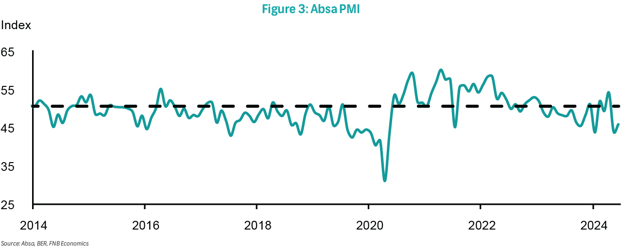 The Absa manufacturing PMI increased to 45.7 index points in June, from 43.8 points in May, but remained in contractionary territory. Weak demand has weighed on the sector in 2Q24, outweighing the improvement in electricity supply. In addition, supplier performance has worsened, indicating that port issues remain a drag on the sector. New sales orders were sideways at 37.9 points from 37.8 points previously, while the business activity index declined further to 36.3 from 38.1 points in May. On a quarterly basis, business activity has shown limited improvement from 1Q24, suggesting a weak contribution to GDP growth by the manufacturing sector. On the positive end, purchasing prices are easing and expectations for near-term business conditions are upbeat, likely reflecting easing political uncertainty as well as an anticipated improvement in global activity as monetary policy eases.
