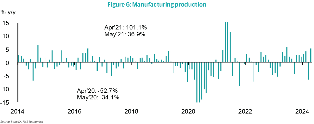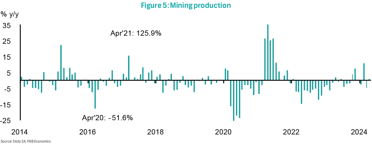 On Thursday, data on mining production for May will be released. Total mining production, not seasonally adjusted, increased slightly by 0.7% y/y in April after declining by 4.8% y/y in March. Seasonally adjusted output increased by 0.8% m/m, which was insufficient to reverse the 4.4% monthly decline in the prior month. The subdued monthly rebound, especially after the mining sector de-stocked in 1Q24, is concerning given that the country did not experience load-shedding in April. This likely reflected subdued, albeit stable, external demand and relatively weak commodity prices.
