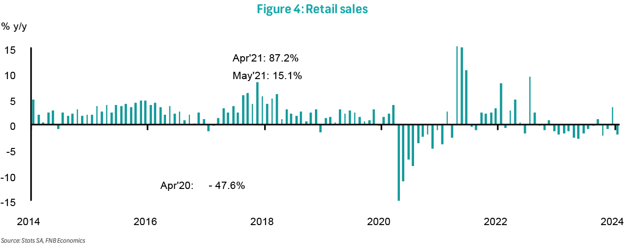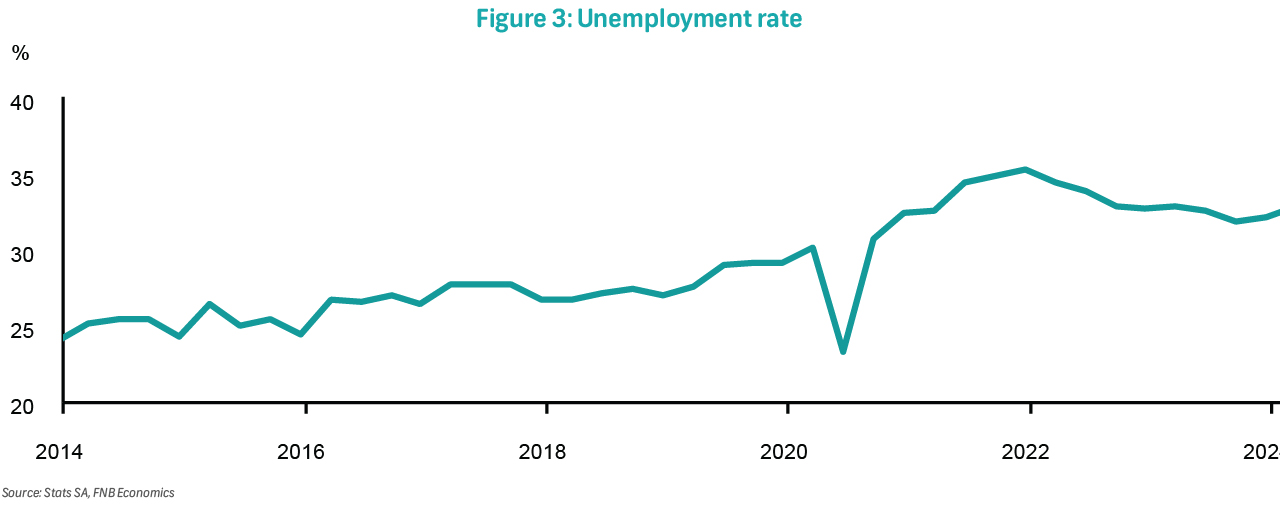 The Quarterly Labour Force Survey (QLFS) data for 2Q24 will also be released on Tuesday. In 1Q24, the QLFS indicated modest net employment gains of 21 555, almost entirely offsetting the 21 587 job losses recorded in 4Q23. However, the unemployment level surged by 330 454, reaching 8 225 889 due to a significant influx of new entrants into the labour market. As a result, the official unemployment rate rose from 32.1% to 32.9%, reflecting less favourable labour market conditions.
