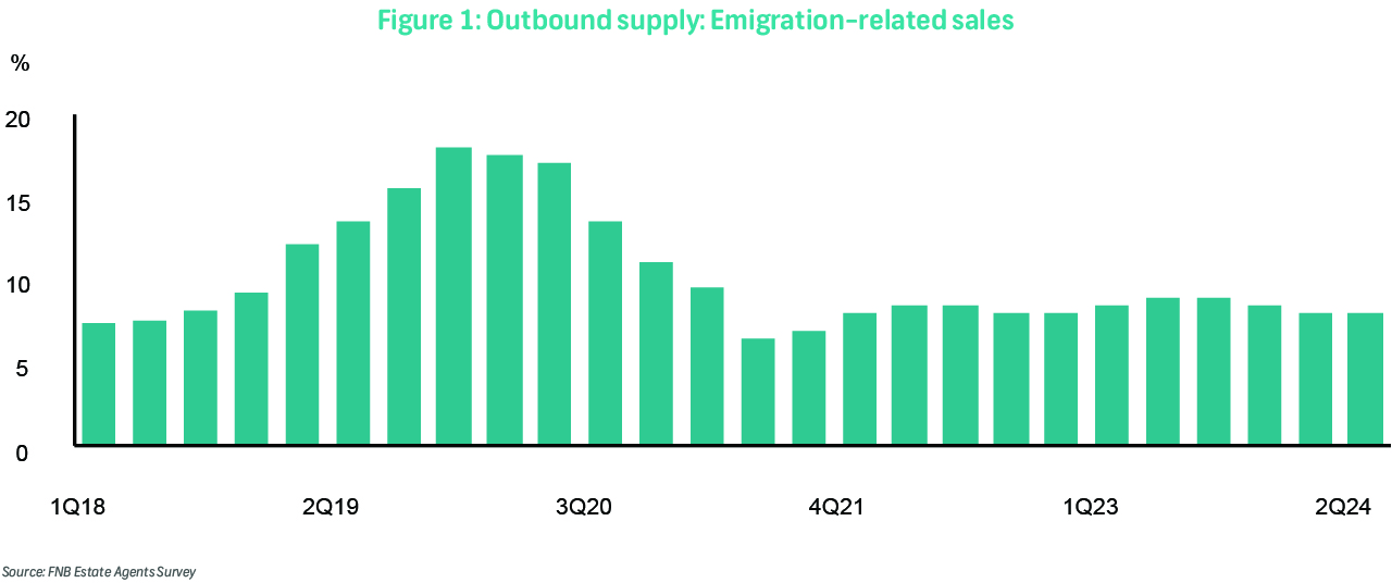 In the survey we compiled data on primary reasons behind property transactions, including emigration. We term this "outbound supply." Additionally, we gauged property acquisitions by foreign nationals and South African expatriates, revealing the "inbound demand." Finally, we contrasted these dynamics, to gain insights into the directional effect of migration on the market. We define this as the net foreign demand which denotes the divergence between inbound demand and outbound supply. A negative value for net foreign demand indicates that migration contributes to an excess supply of homes available for sale, thereby collectively exerting downward pressure on prices.