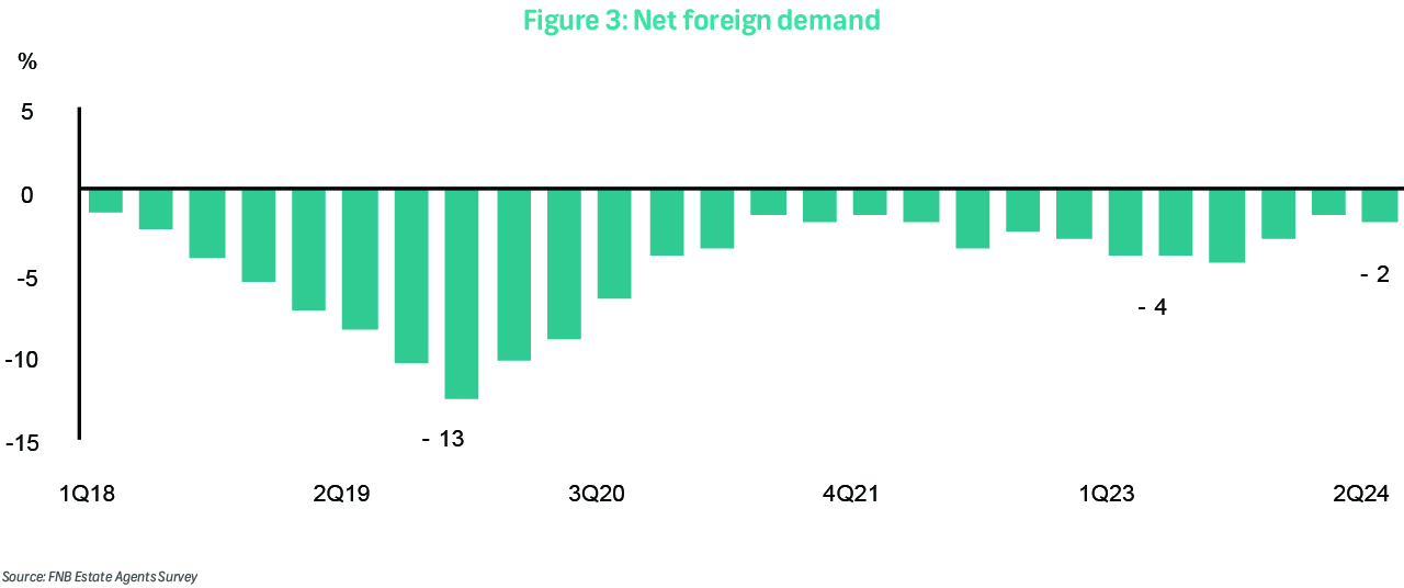 For 2Q24, our estimates indicate that net foreign demand stood at approximately -2% of domestic volumes, an improvement from -4% a year ago (Figure 3). This underscores the demand deficit generated by migration, necessitating local buyers to bridge the gap to maintain equilibrium between supply and demand. While net foreign demand remains negative, the recent improvement in sentiment and favourable exchange rates suggest that foreign participation in the South African property market may increase. If this trend continues, it could contribute to a more balanced market and potentially support house price growth.