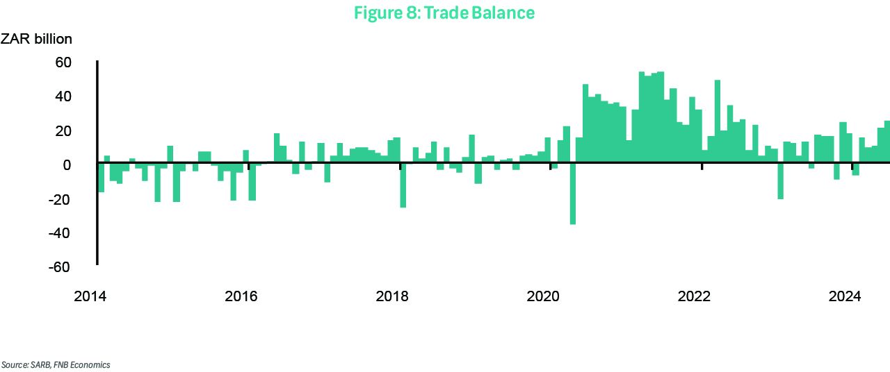 Also on Friday, the trade balance for July will be published. The trade balance recorded a surplus of R24.2 billion in June, up from a downwardly revised R20.0 billion (previously R20.1 billion) in May. This improvement occurred despite a 3.4% monthly decline in exports to R172.0 billion, as a significant 13.6% monthly decline in imports maintained the surplus. Year-to-date (January to June), the decline in imports has been broad-based across major merchandise categories despite a less depreciated rand, reflecting subdued domestic demand.
