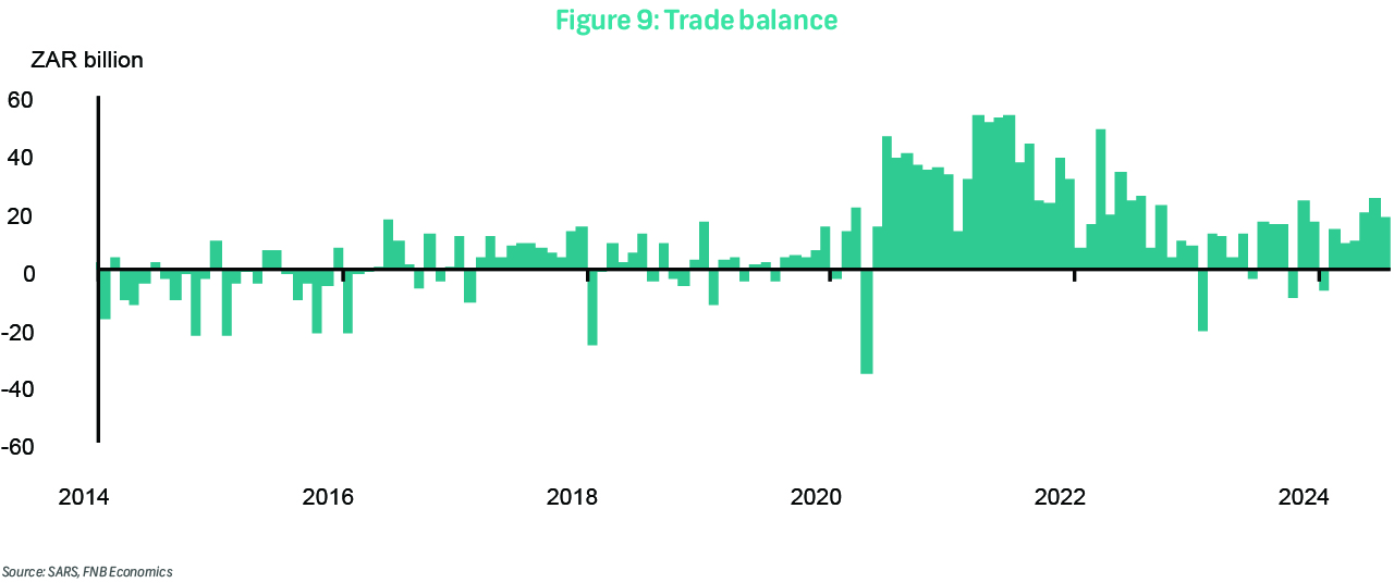 Also on Monday, the trade balance data for August will be published. In July, the trade balance recorded a surplus of R17.6 billion, slightly lower than the R24.2 billion surplus recorded in June. The narrowing of the trade surplus reflected a 6.6% monthly increase in imports to R157.4 billion, while exports increased marginally by 1.8% to R175.0 billion. Still, the year-to-date (January to July) surplus amounted to R85.3 billion, 181% more than what it was over the corresponding period last year. This sustained trade surplus underscores weak domestic demand, with imports down by 6.4%. Meanwhile, exports are down marginally by 0.7%.