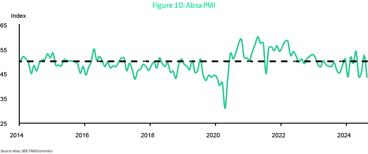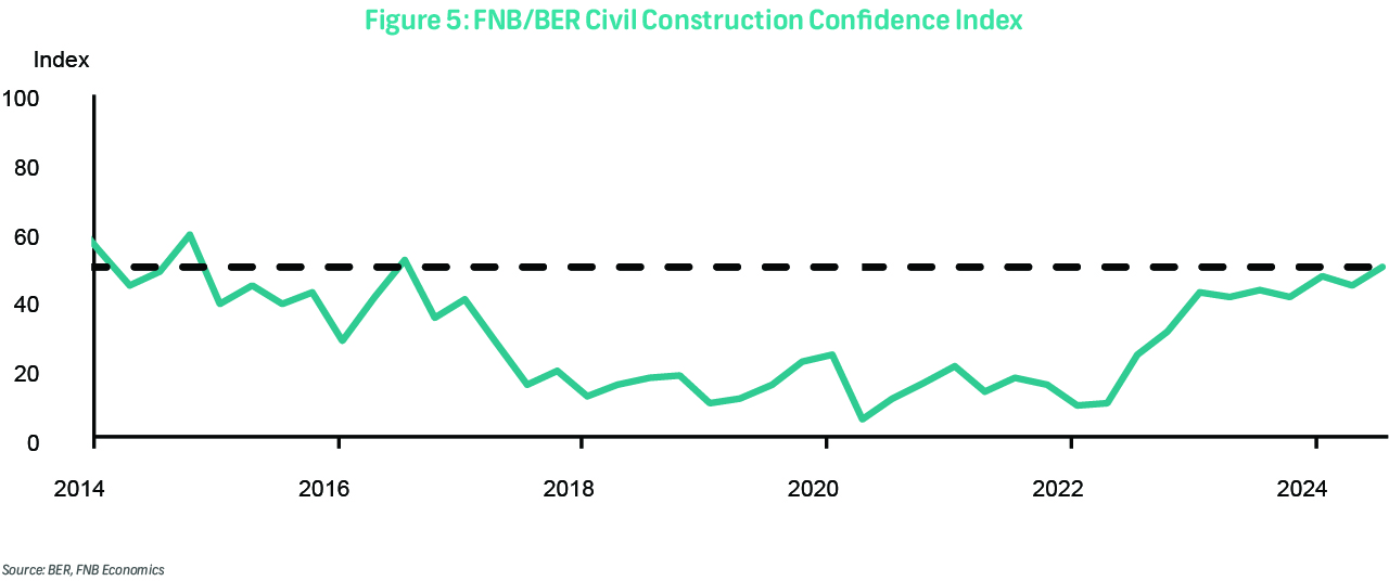 The FNB/BER Civil Confidence Index surged to a new eight-year high of 50 index points in 3Q24, rebounding from 44 points in 2Q24. This improvement was primarily driven by a significant recovery in profit margins, reaching their highest level since 2008. While activity growth moderated slightly in 3Q24 compared to the previous year's peak, the survey indicated increased tender activity and growing intentions to expand employment. However, respondents continued to express concerns about the negative impact of the construction mafia and government inefficiency on the sector.