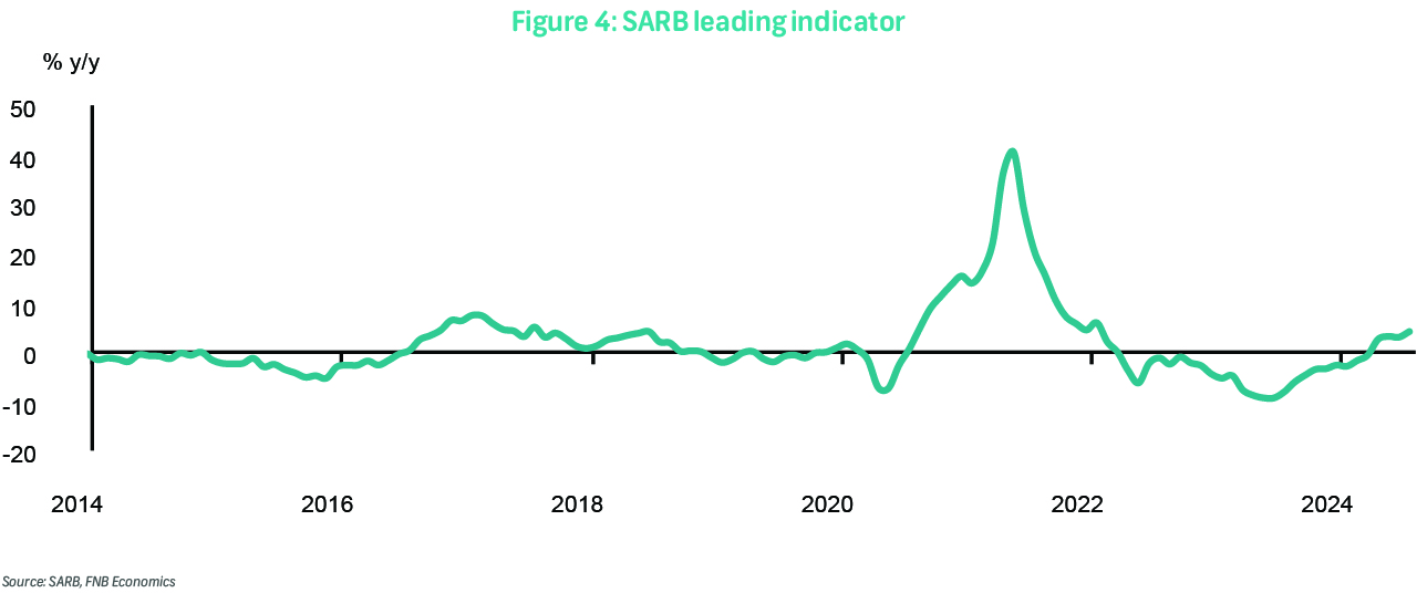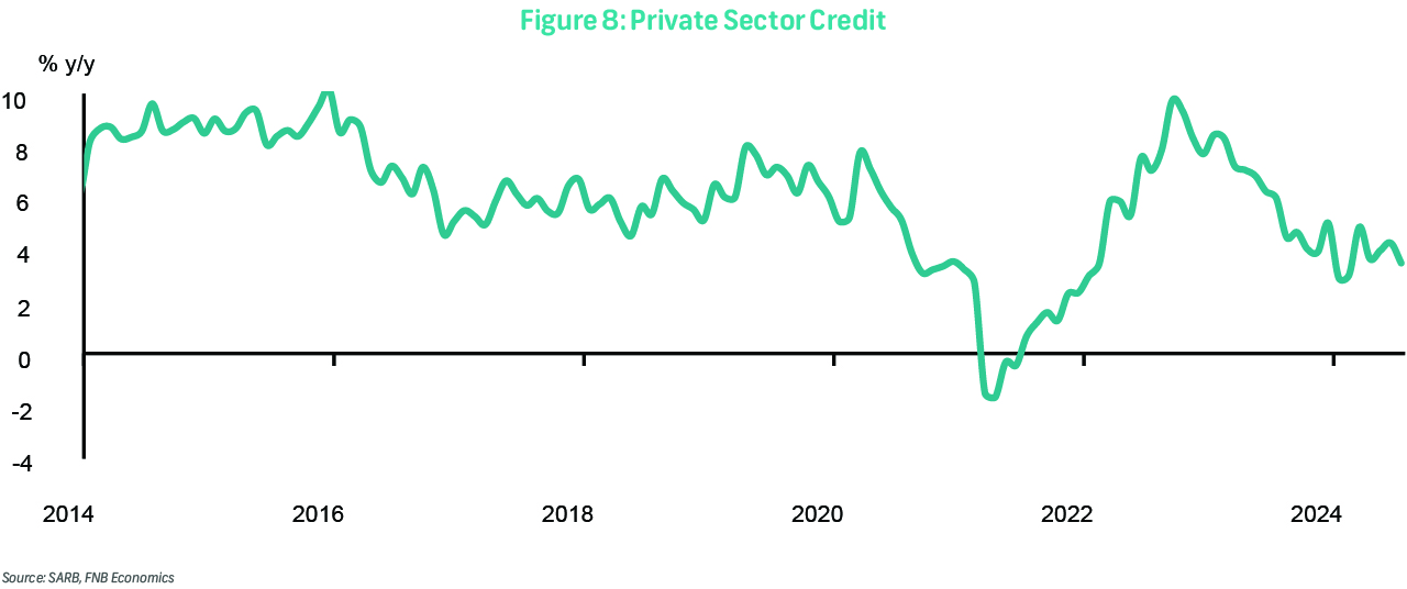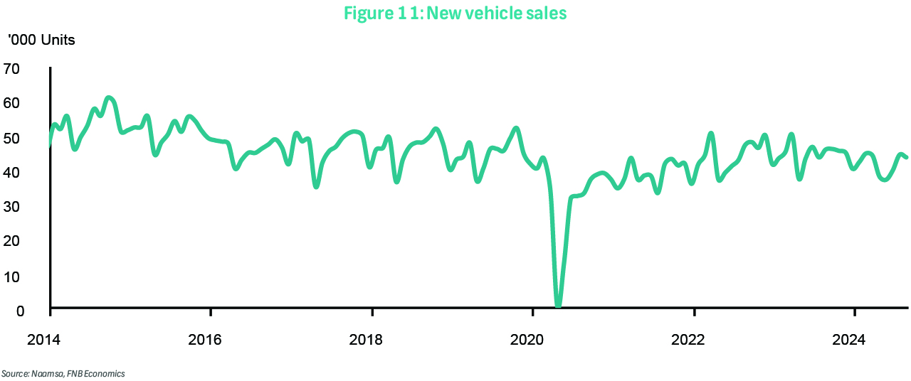 The 2Q24 data reveals that households are still reeling from high inflation and a stalling job market. While real disposable income increased by 0.4%1, labour income-crucial for most South African households-lagged inflation. The wage bill grew by 0.8% quarter-on-quarter (q/q), while inflation stood at 1.3% during the same period. Conversely, non-labour income surged by 3.7% q/q, buoyed by robust interest income from the high-interest rate environment and some support from dividend payouts. Looking ahead, as of 3Q24, surveyed expectations for salary increases average 5.6% for 2024, compared to our inflation forecast of 4.6%, suggesting that a real-wage recovery is underway. Anecdotal evidence from direct salary payments shows sustained inflation-adjusted growth in the last five months to August2, the first time since the pandemic. We anticipate that inflation will remain below the target of 4.5% over nearly the next year of data, with salary expectations for the next calendar year currently at 5.9%. This will further support real wages into 2025. Additionally, lower debt-service costs (more on this below) will boost consumer discretionary incomes, suggesting an improved consumer environment ahead.