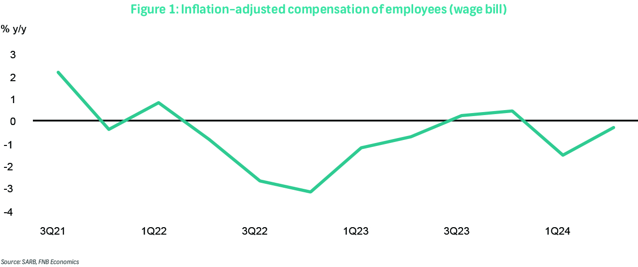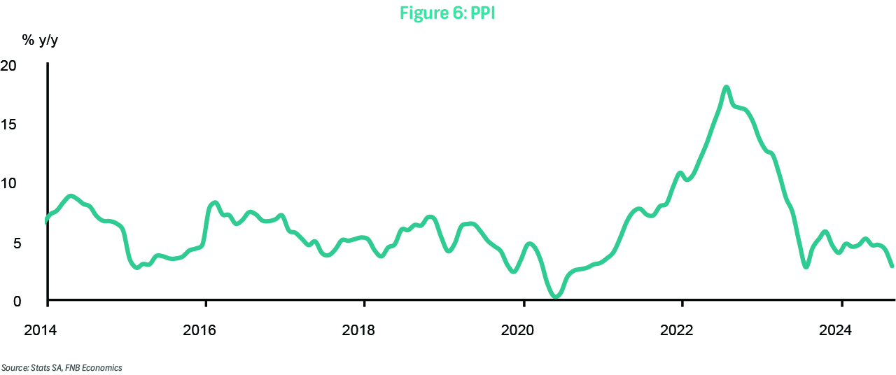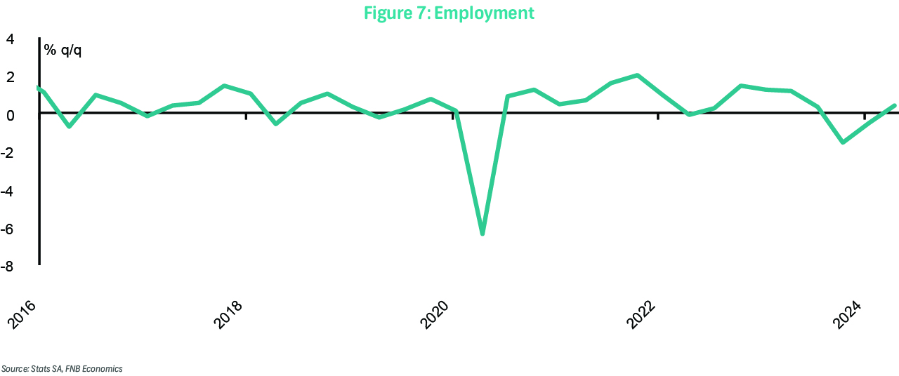 Employment in the formal non-agricultural sectors of the economy, as reflected in the Quarterly Employment Survey, increased by over 40 000 jobs or 0.4% q/q in 2Q24. Most of these jobs were in community services, which added over 90 000 jobs, or 3.1% q/q. Compared to 2Q23, 144 000 jobs (-1.3%) have been lost but over half a million jobs have been added since 2Q19. The latest estimates reflect over 10.7 million workers in the formal economy. Total gross earnings declined by 0.5% q/q but were 3.9% higher than in 2Q23. Notably, earnings were 34% higher than 2Q19 levels, beating inflation of 28%. With easing policy uncertainty and growing confidence in the economy's trajectory, growth and employment creation should improve. Furthermore, slower inflation should support profitability.