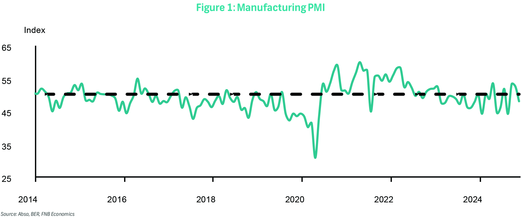 The manufacturing PMI fell below the neutral level in November, recording 48.1 index points from 52.6 points in October. The past two months of data suggests a slowing in recovery momentum in the manufacturing sector - likely related to weak demand. In line with this, business activity and new sales orders slowed, posting 49.0 points (from 55.6) and 45.9 points (from 54.8), respectively. Fortunately, global demand continues to improve and should be joined by local demand going into 2025. This should have contributed to near-term expectations remaining upbeat, at 62.3 points. Risks to the outlook include supplier performance as demand improves, a slower deceleration in producer costs, as well as weaker global trade and activity.