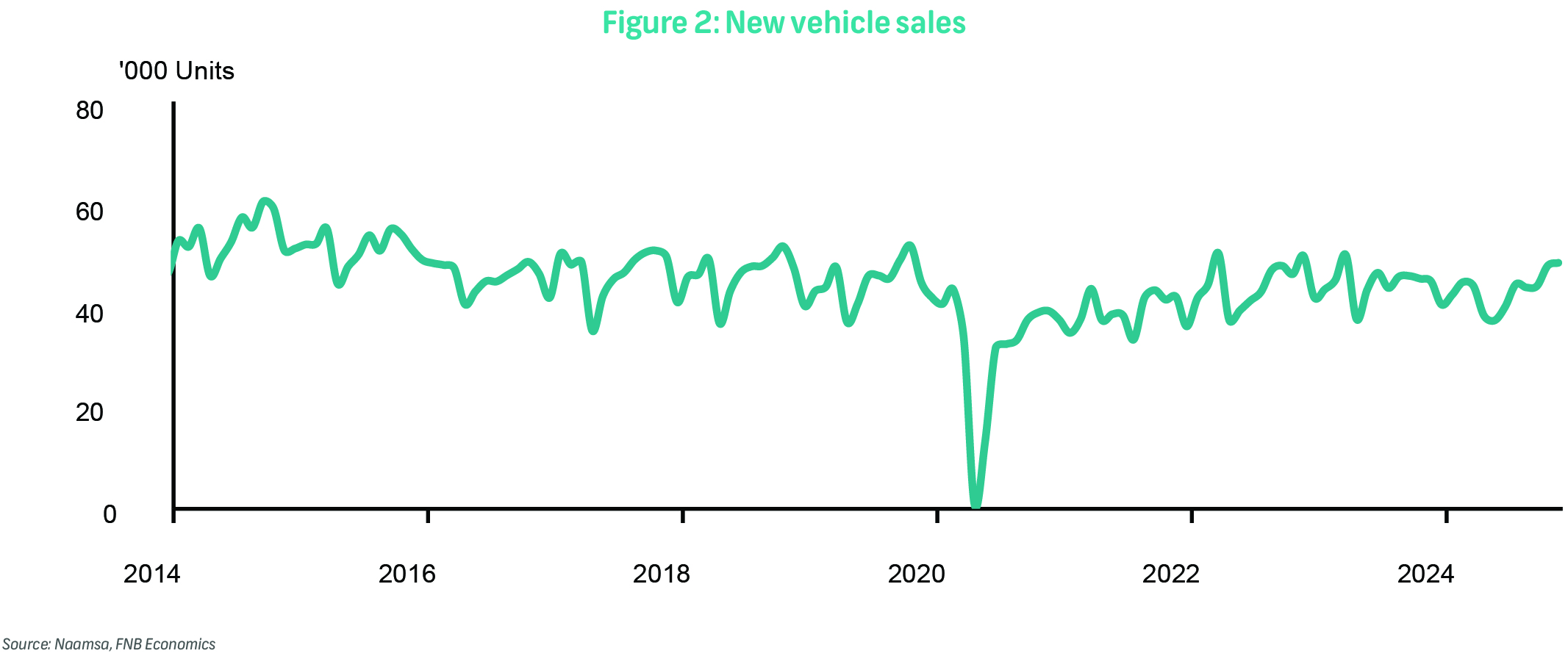 New vehicle sales increased to 48 585 units in November, up by 3 658 units or 8.1% from a year ago. Passenger car sales recorded an increase of 20.0% y/y, still supported by seasonally strong car rental demand which accounted for 19.5% of total passenger car sales. Light commercial vehicles, bakkies, and mini-bus sales declined by 16.3% y/y, while medium as well as heavy truck and bus sales declined by 9.2% y/y and 0.5%, respectively. Year-to-date, new vehicle sales were 3.5% lower than in the corresponding period last year and have struggled to recover to pre-pandemic level. Slower inflation and a continued fall in interest rates should support the consumer environment going into 2025, while continued structural reform should support employment prospects and the operating environment.