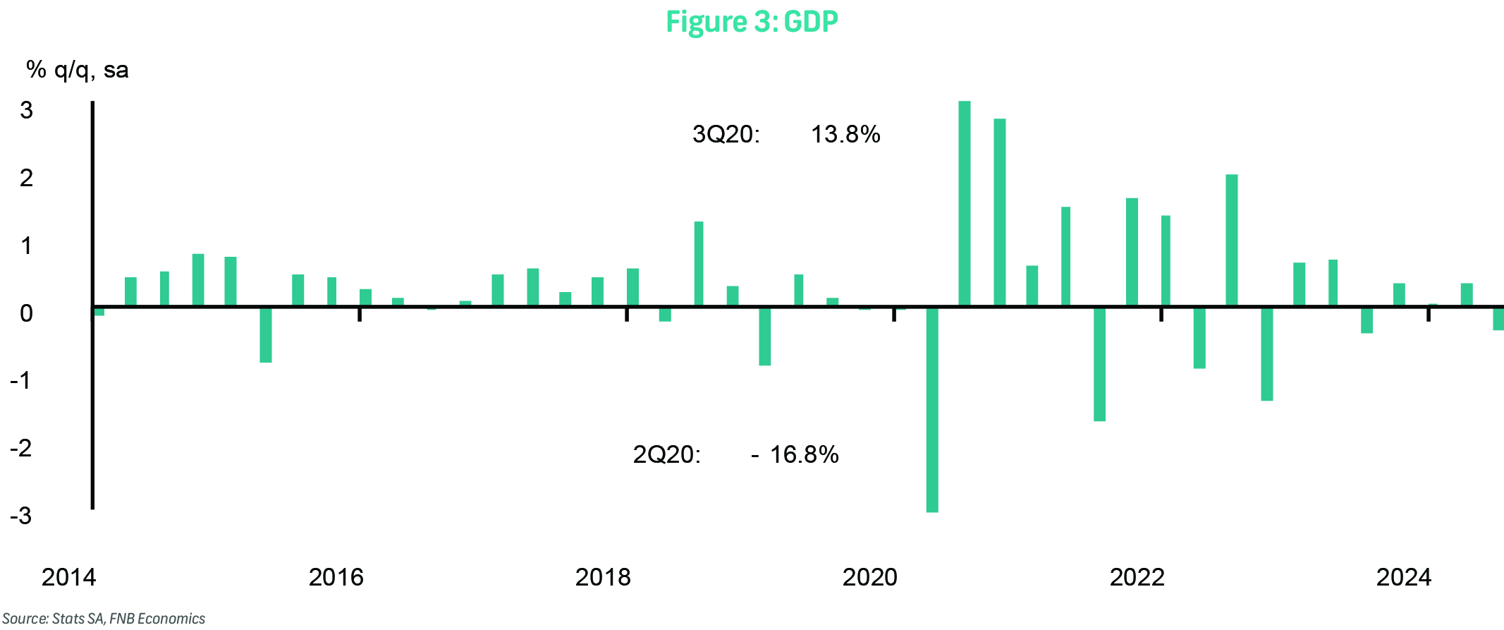 Electricity production increased by 2.7% y/y in October, after increasing by 8.5% y/y in September, marking the eleventh successive month of annual increase. This is consistent with the Eskom's improved energy availability factor, which averaged around 63% in October this year compared to 57% in October last year. However, seasonally adjusted electricity production declined by 1.4% m/m, signalling a weak start to the fourth quarter. In 3Q24, electricity production expanded by 2.8% q/q, providing some support to economic growth, though insufficient to offset the contraction in agriculture.