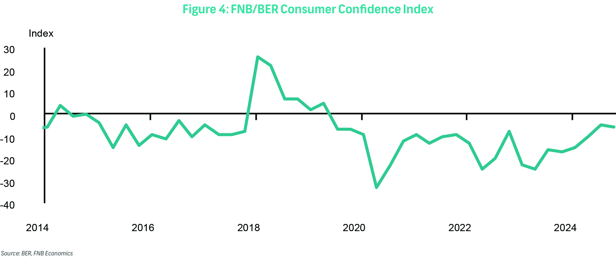 The FNB/BER Consumer Confidence Index (CCI) slipped to -6 index points from -5 points in 3Q24. Nevertheless, the current level of the CCI is the highest festive season reading since 2019 and is considerably higher than the -17 points recorded in 4Q23. While sentiment towards the outlook on the economy and household finances was less upbeat, it remains higher than the willingness of consumers to purchase durable goods at this time. That said, we continue to see an improvement in the latter indicator. Furthermore, and in line with less domestic political and policy uncertainty, the confidence of higher-income households continues to improve. We are concerned that an uncertain global environment, a weaker rand, and rising local fuel prices will weigh on sentiment in the near term. However, a softening cost-of-living and the implementation of the two-pot retirement system should remain catalysts for improved consumer confidence - especially for middle-to-lower-income households.
