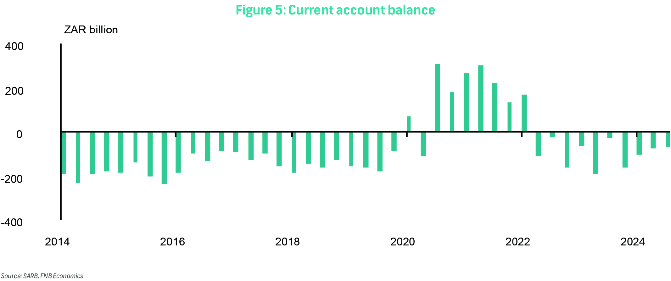 The current account deficit narrowed further to R70.8 billion in 3Q24 from a revised R75.3 billion in 2Q24 (previously R64.6 billion). As a percentage of GDP, the current account deficit was 1.0%. The improvement came despite a slightly narrower trade surplus on goods, which decreased from R179.5 billion to R177 billion (2.4% of GDP), but rather reflected a narrowing in the services, income, and transfer account deficit (SIT), from -R254.7 billion to -R247.8 billion (-3.4% of GDP). There was a decline in total export values which was worse than the decline in imports, and both reflected lower prices and volumes. South Africa's terms of trade improved, highlighting a faster fall in rand-denominated import prices versus the prices of exports. This data suggests that the deterioration in the current account deficit that is anticipated for this year will be less pronounced than previously feared. However, logistical constraints remain a key hindrance to export growth and, alongside rising domestic demand, increases the odds of worse current account dynamics over the medium term.