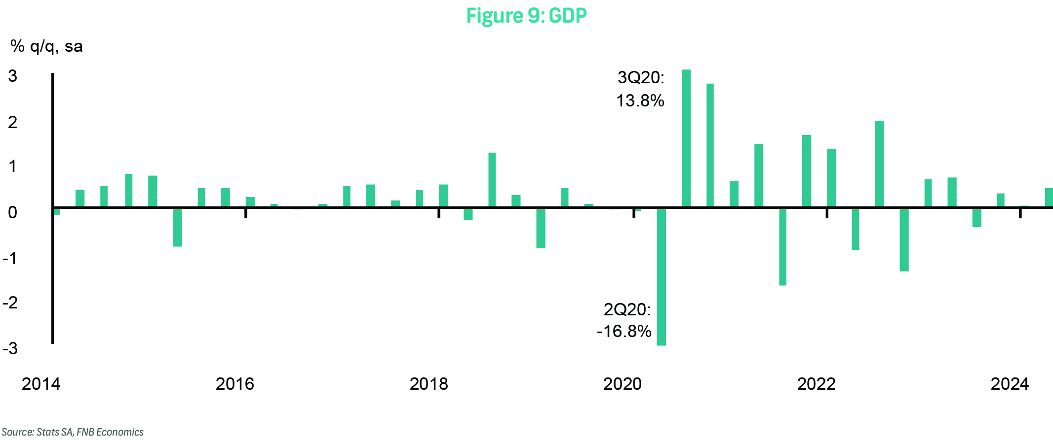 On Tuesday, data on GDP for 3Q24 will be released. In 2Q24, GDP grew by 0.4% q/q (seasonally adjusted) and 0.3% y/y (non-seasonally adjusted). Growth in that quarter was broad-based, with positive contributions from seven out of ten sectors. However, GDP demand components showed a mixed performance: household and government spending rebounded, while fixed investment and exports contracted. For 3Q24, we expect GDP growth momentum to have been sustained, at an increase of 0.3% q/q and 1.1% y/y. This is supported by quarterly increases in electricity and mining production, along with marginal improvements in manufacturing output. Retail trade sales will also provide support to GDP growth, but this will be counteracted by a decline in wholesale and motor trade sales. The volatile agricultural sector remains a potential swing factor, which could either bolster or weaken overall growth outcomes.