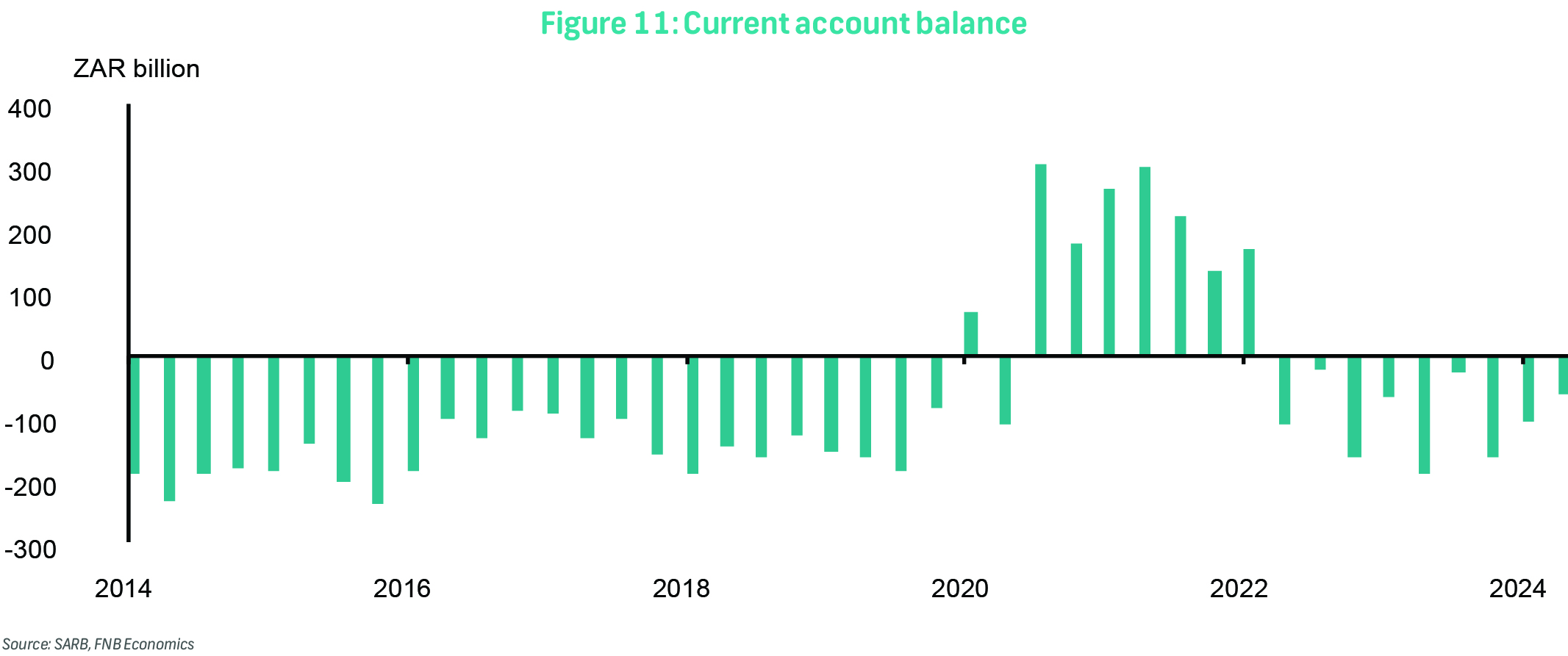 On Thursday, data on the current account for 3Q24 will be published. The current account deficit narrowed significantly again in 2Q24. It recorded R64.6 billion, from R106.9 billion in 1Q24, and 0.9% of GDP, from 1.5% previously. The improvement was supported by a wider trade surplus on goods, which increased from 2.3% of GDP to 2.6%. The lift in total export values reflected higher prices, while that in total import values was on account of both prices and volumes. The services, income, and transfer account deficit also narrowed, from R272. 7 billion to R252.1 billion and 3.8% of GDP to 3.4%. This was a result of a narrower primary income account deficit. South Africa's terms of trade also improved, highlighting the gains from rangebound oil prices and rising gold prices over 2Q24. Since then, oil prices have softened, and gold prices have remained resilient. This data suggests that the deterioration in the current account deficit that is anticipated for this year may be limited. However, logistical constraints remain a key hindrance to export growth and, alongside rising domestic demand, increases the odds of worse current account dynamics over the medium term.