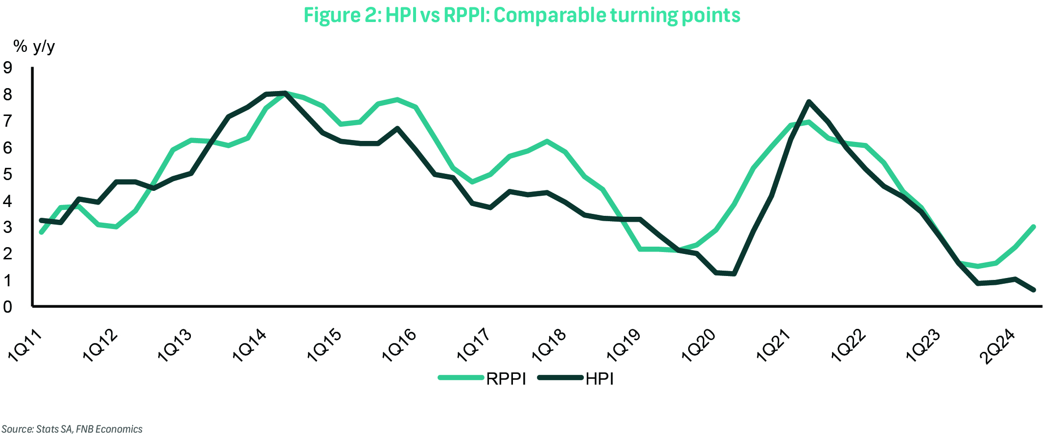 While both the RPPI and FNB HPI provide valuable insights into the domestic housing market, their distinct methodologies, data sources, and scopes offer different perspectives. Figures 1 and 2 show that while they may produce slightly different results, they generally align in terms of overall trends. That said, it is crucial to consider the nuances and limitations of each index when interpreting the data, to gain a more comprehensive understanding of the South African housing market.