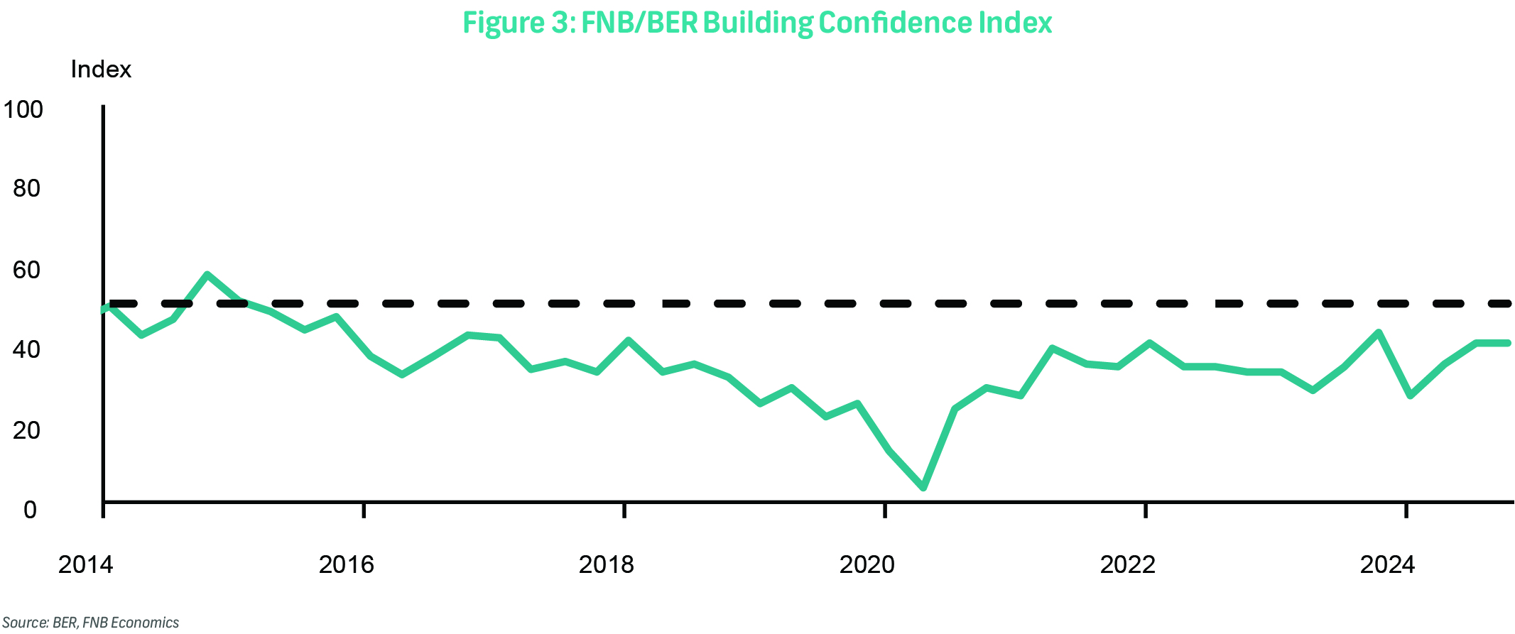 The FNB/BER Building Confidence Index remained unchanged at 40 index points in 4Q24. While this indicates that most respondents (60%) are still dissatisfied with current business conditions, there are some positive developments. Main contractors experienced a significant improvement in activity, employment, and profitability, leading to a decade-high confidence level. This was driven by increased activity, particularly in residential building, which partially recovered after a weak performance in previous quarters. Non-residential activity also continued to increase, albeit from a low base. However, despite the positive momentum, main contractors are still concerned about the short-term outlook due to weak order books and the ongoing impact of the construction mafia. Sub-contractors, on the other hand, faced challenges due to a decline in residential solar installations, leading to decreased confidence. While building material manufacturers saw some improvement in production and reduced costs, overall confidence remains low. Architects and quantity surveyors experienced some improvement in activity but were hindered by municipal delays and payment issues. Overall, the survey shows a mixed outlook for the building sector. While current work is generally plentiful, capacity constraints at a municipal level and security issues at construction sites linger, weighing on sentiment.