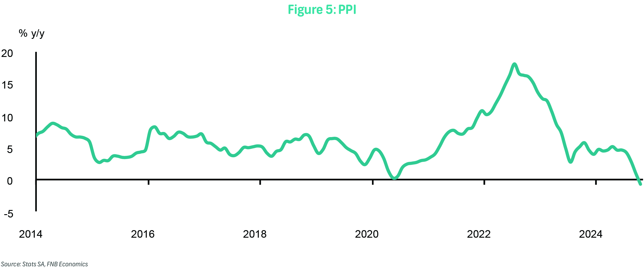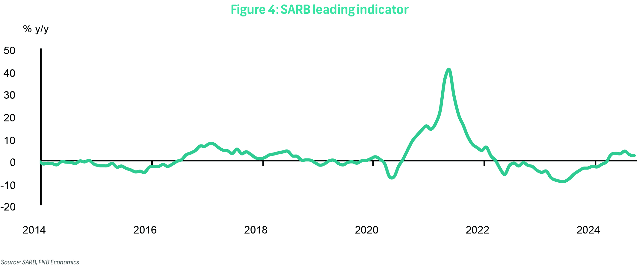 On Wednesday, the FNB/BER Consumer Confidence Index (CCI) will be released. In 3Q24, the CCI continued to improve, rising by seven index points to -5, marking the highest level in five years. The positive momentum was supported by factors such as the formation of a Government of National Unity, the absence of load-shedding, a stronger rand, lower inflation, and the implementation of the two-pot retirement system. Across income groups, high-income households saw the most significant improvement, followed by middle-income households. By contrast, sentiment among lower-income households backpedalled in 3Q24.