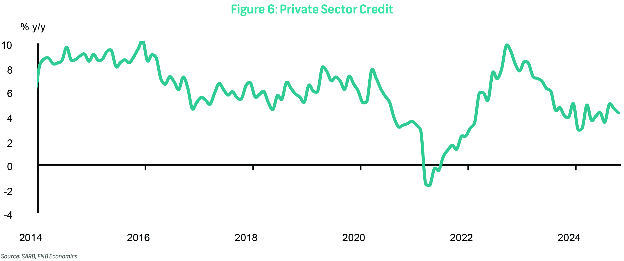 Within household credit, unsecured general loans and advances contracted by 1.2% y/y, marking the seventh consecutive month of decline. Growth in mortgage advances slowed to 2.3% from 2.4% in September, while instalment sales credit, primarily vehicle finance, expanded by 7.3%, marginally down from 7.4% in the previous month. On the corporate side, instalment sales credit grew by 6.9%, reflecting a deceleration from 7.3% in September. However, corporate mortgage advances strengthened, rising by 4.9%, compared to 4.6% in September. General loans and advances to corporates also accelerated, with growth increasing to 4.5% y/y from 3.8% in September.