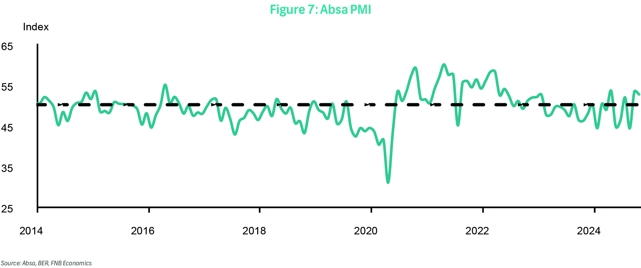 On Monday, the Absa manufacturing PMI for November will be published. In October, the PMI declined to 52.6 index points, from 53.3 in September. Although recording some slowing, the index remained above the neutral level - indicating that manufacturing activity remained expansionary. The PMI was supported by improved business activity, which lifted from 51.5 points to 55.6, and, although new sales orders slowed slightly from 56.2 points to 54.8, they remained above the neutral mark and suggest conducive demand conditions. Encouragingly, supplier performance appears to be improving and better able to cope with demand. Near-term expectations remain upbeat, and should be supported by falling inflation, lower interest rates, and generally improving consumer dynamics.