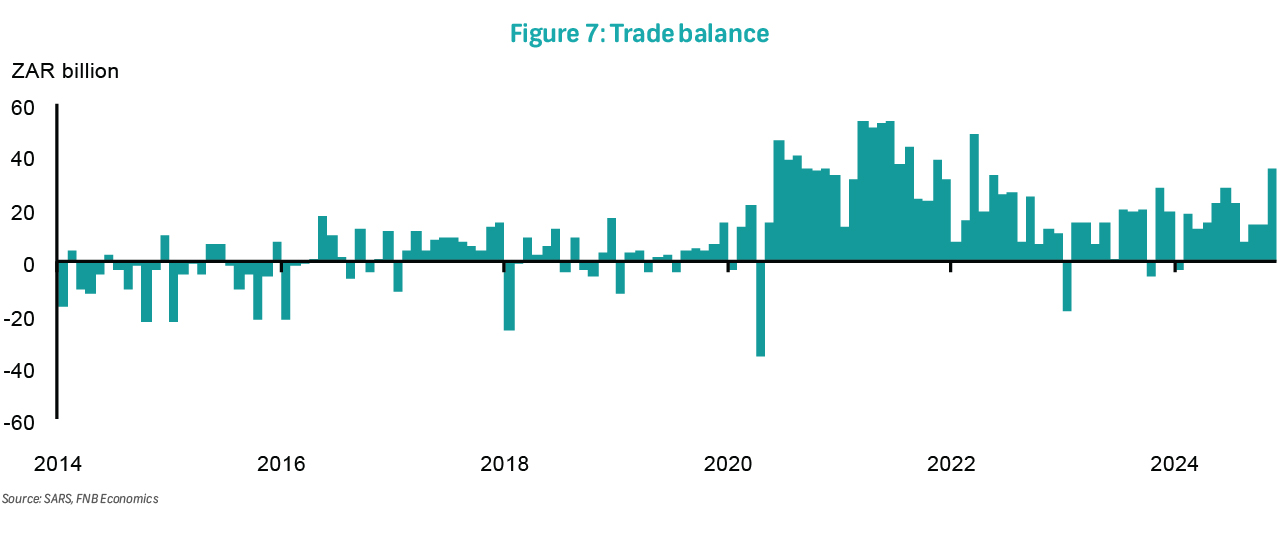 On Friday, the monthly trade balance for December will be released. In November, the trade balance recorded a surplus of R34.7 billion, the largest monthly surplus since March 2022, when it reached R47.2 billion. Exports rose by 1.2% m/m to R180.9 billion, while imports saw a significant decline of -11.2% m/m to R146.2 billion. For the first eleven months of 2024, the trade balance registered a cumulative surplus of R181.3 billion, a notable increase compared to the R110.9 billion surplus during the same period in 2023. During this time (January to November 2024), exports declined slightly by just over 1%, while imports fell by 6.7%. The drop in imports primarily reflects subdued demand for machinery and electrical equipment, vehicles and transport equipment, and mineral products.
