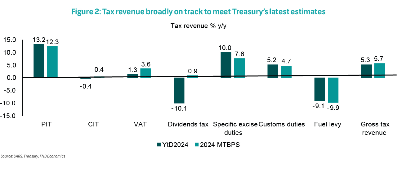 Despite challenges, tax receipts remain broadly on track to meet Treasury's latest estimates (Figure 2). Total gross tax revenue rose 5.3% in the fiscal year-to-date (April-December), compared to Treasury's full-year projection of 5.7% growth for 2024/25