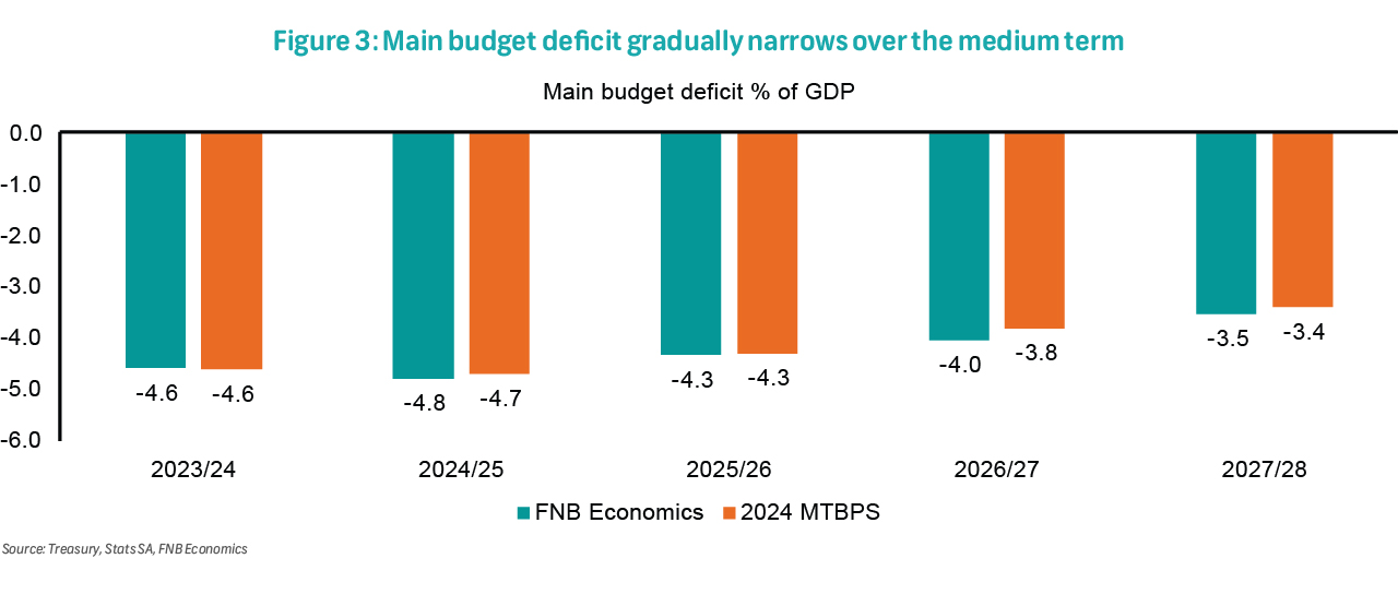We expect the main budget deficit to reach R355.7 billion (4.8% of GDP) in 2024/25, slightly wider than the R324.2 billion (4.6% of GDP) recorded in 2023/24. Over the medium term, the deficit is projected to gradually narrow to around 3.5% of GDP by 2027/28. Meanwhile, we anticipate debt to peak at 77.7% of GDP in 2027/28―a more extended trajectory than Treasury's projected peak of 75.5% in 2025/26. Treasury's primary surplus target, a key anchor for fiscal policy, is expected to rise to 1.8% of GDP by 2027/28, while our estimate is more conservative at 1.3% of GDP. However, if growth and revenue outperform current projections-and non-interest spending remains disciplined―the debt peak could occur sooner than expected.