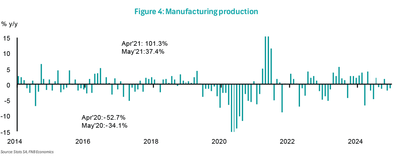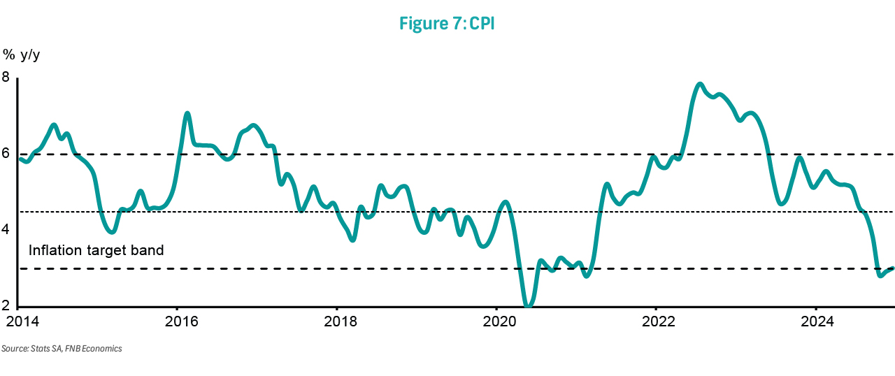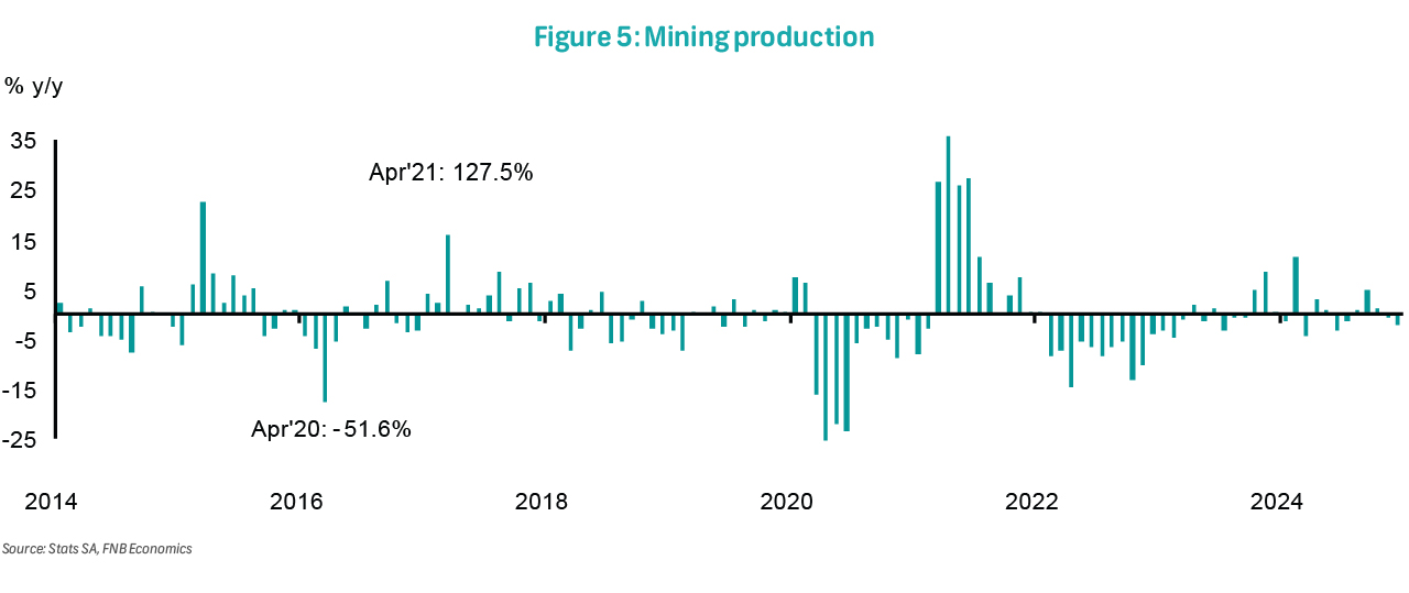 Despite domestic and external demand challenges, mining output grew by a modest 0.4% in 2024, following a 0.1% increase in 2023 and a sharp 7.8% contraction in 2022. While the continued suspension of load-shedding and gradually stabilising logistics should support mining output recovery, a challenging global trade environment, subdued commodity prices, and slowing growth in China pose significant headwinds.
