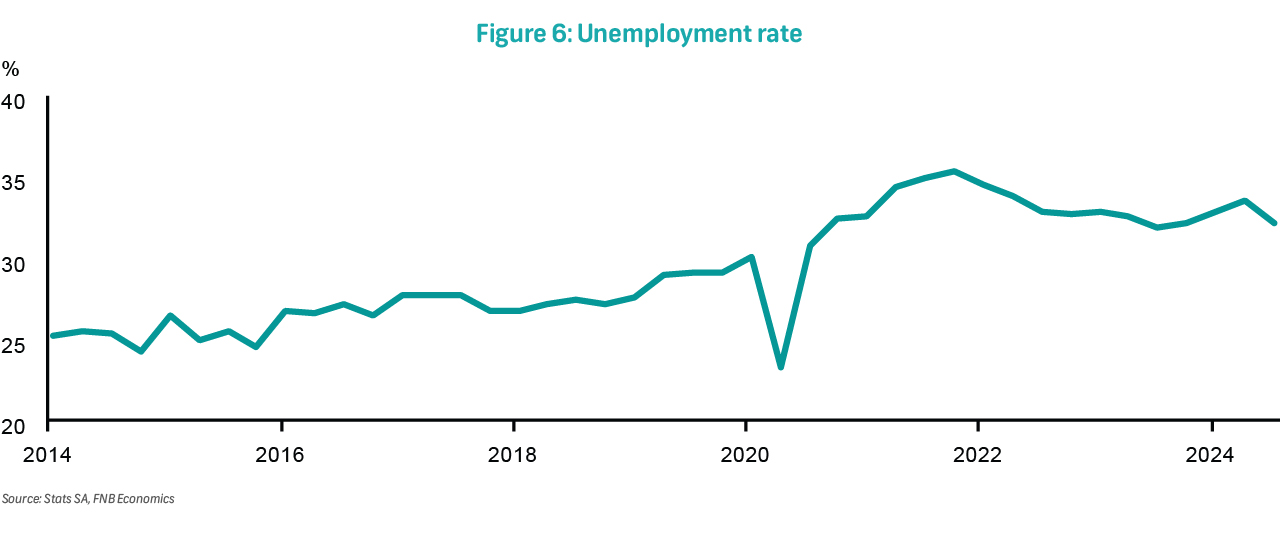 On Tuesday, the Quarterly Labour Force Survey (QLFS) for 4Q24 will be released. In 3Q24, QLFS data showed an increase in employment by 293 810 q/q, completely offsetting the 92 416 jobs lost in 2Q24. Unemployment fell by 373 305 q/q, bringing the total number of unemployed individuals to 8 010 520. The official unemployment rate was 32.1% in 3Q24, reflecting a decrease from 33.5% in 2Q24. Youth unemployment remains critically high at 60.2% for the 15 to 24 age group, and 40.4% for the 25 to 34 age group, underscoring the urgent need for pro-growth structural reforms to spur economic expansion.