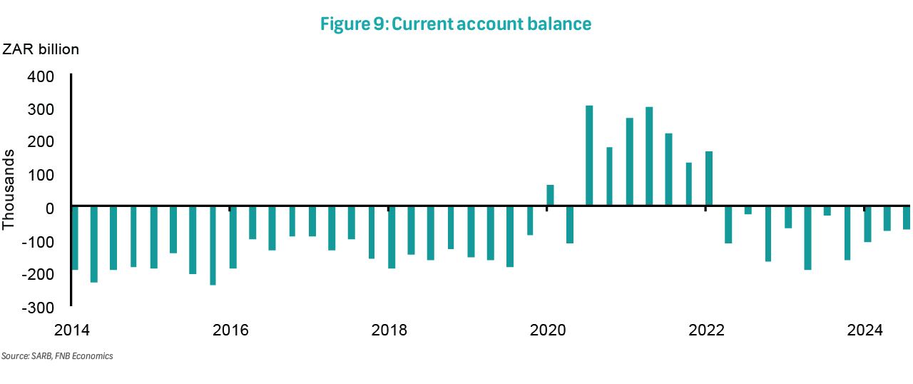 On Thursday, the current account balance for 4Q24 will be released. The current account deficit narrowed further to R70.8 billion in 3Q24 from R75.3 billion in 2Q24. As a percentage of GDP, the current account deficit was 1.0%. The improvement came despite a slightly narrower trade surplus on goods, which decreased from R179.5 billion to R177 billion (2.4% of GDP), but rather reflected a narrowing in the services, income, and transfer account deficit (SIT), from -R254.7 billion to -R247.8 billion (-3.4% of GDP). There was a decline in total export values, which was worse than the decline in imports, and both reflected lower prices and volumes. South Africa's terms of trade improved, highlighting a faster fall in rand-denominated import prices versus the prices of exports. This data suggested that the deterioration in the current account deficit for 2024 would likely be less pronounced than previously feared. However, logistical constraints remain a key hindrance to export growth and, alongside rising domestic demand, increases the odds of worse current account dynamics over the medium term.