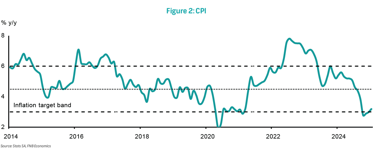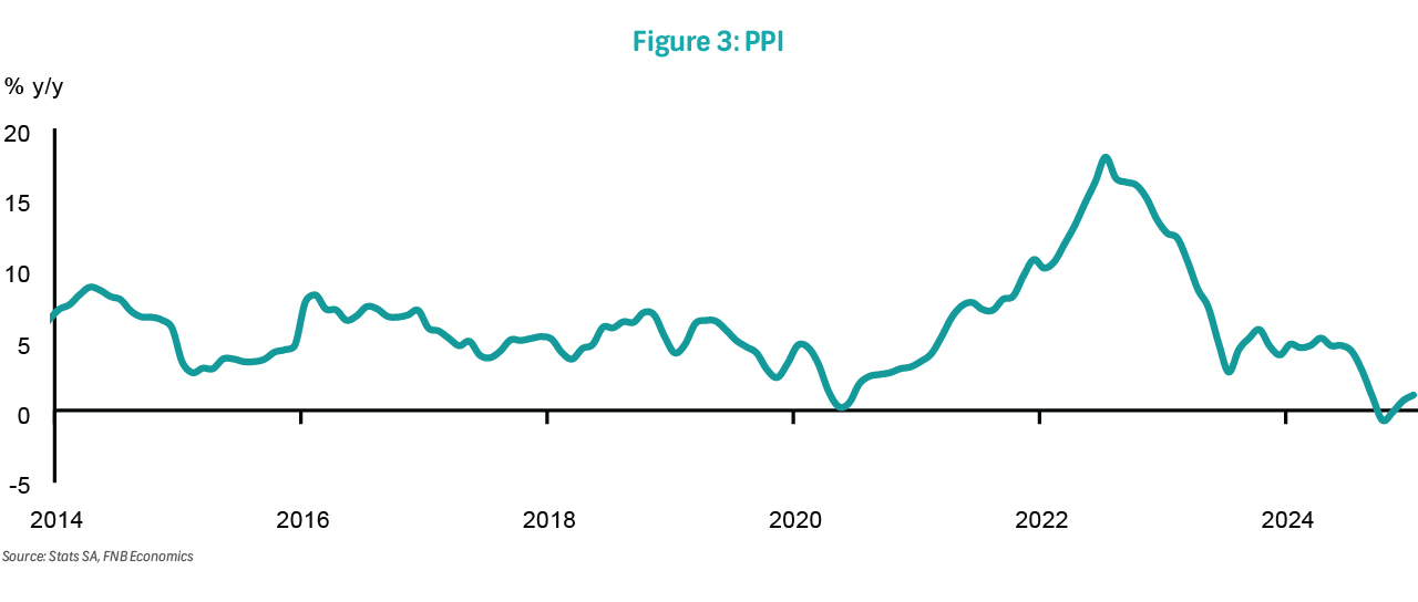 Headline inflation was 3.2% y/y in January, up from 3.0% in December. Monthly pressure was 0.3%, led by contributions from core and food inflation. Inflation should remain subdued in 1H25 before rising steadily into the second half of the year. We see headline inflation posting 3.4% in February and settling above 5% by the end of the year. This will be mainly on account of fading positive base effects and improving demand. Nevertheless, we currently anticipate that average inflation will be softer than in 2024. Risks to the outlook include a more robust normalisation in services inflation as well as a faster acceleration in administered price inflation, especially water services. In addition, any hike in the VAT rate would raise annual inflation. Furthermore, global policy uncertainty should weigh on emerging market currencies, including the rand.