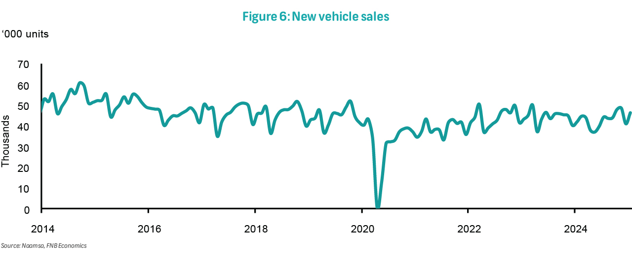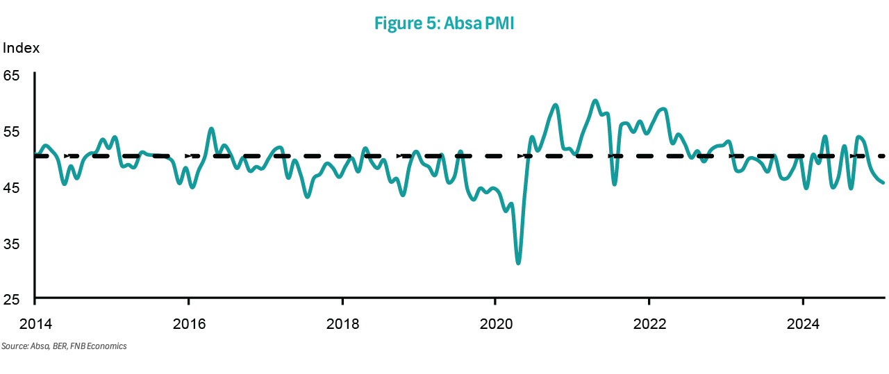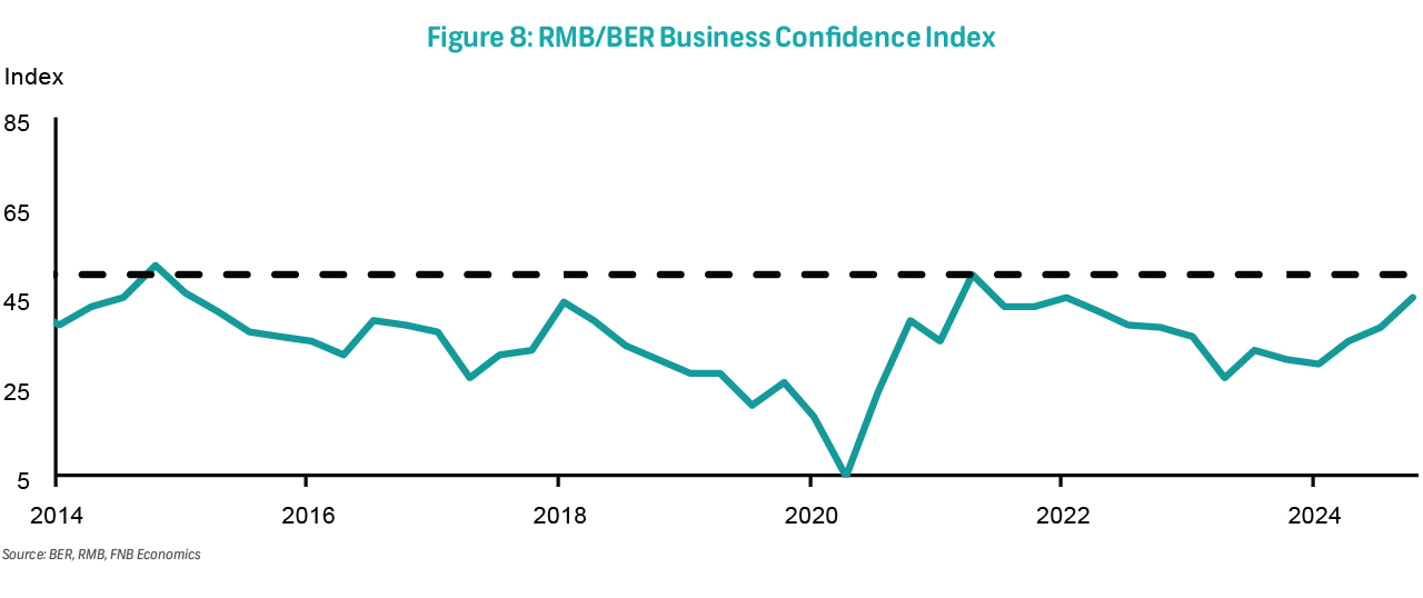 On Wednesday, the RMB/BER Business Confidence Index (BCI) for 1Q25 will be published. The BCI saw a seven-point boost in 4Q24, climbing to 45 index points from 38 in the previous quarter. This positive trend, marking the third consecutive increase, places the index nearly 20 points above its recent low of 27 reached in 2Q23. The uptick in sentiment is driven by improved business activity and operating conditions compared to 3Q24. Moreover, businesses are optimistic about the upcoming quarter. This level of confidence is the highest since 1Q22 and is marginally above the long-term average of 43 index points. The improvement in the BCI was widespread, with only new vehicle dealers experiencing a decline in confidence. All other sub-sectors reported increased confidence, and three - wholesale, retail, and building contractors - even surpassed the 50-neutral level. Notably, all sectors, except new vehicle dealers, now have confidence readings at or above their long-term averages.