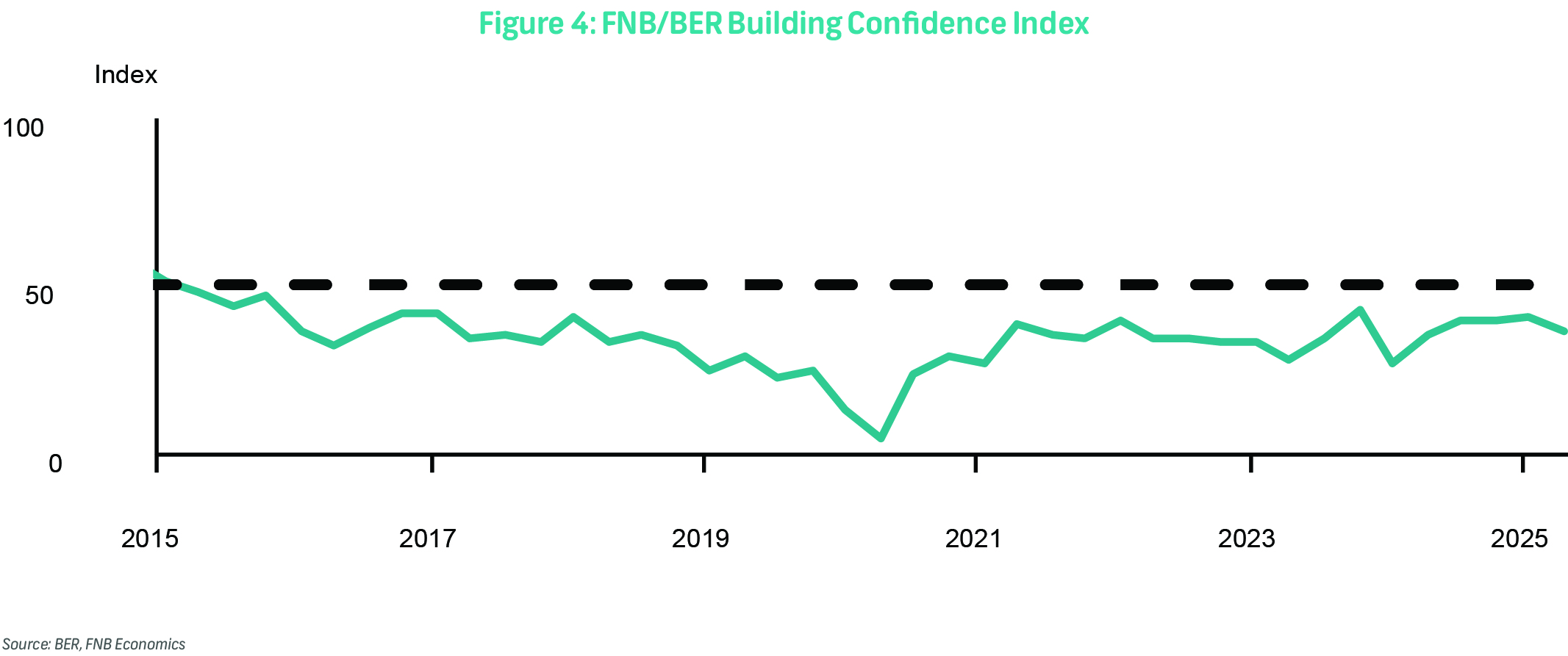 The FNB/BER Building Confidence Index for 2Q25 dropped to 36 index points in 2Q25, down from 41 previously, indicating that nearly two-thirds of respondents are dissatisfied with current business conditions. The biggest drag came from hardware retailers, whose confidence fell by a massive 24 points, mainly due to rising labour costs that hurt profitability—even though sales volumes held up. Main and sub-contractors also reported weaker sentiment, especially in the residential sector, where activity and profitability continued to decline. On the other hand, the non-residential sector is holding up better, supported by demand for industrial and office space. There were some bright spots: architects and quantity surveyors reported strong growth in work, suggesting that building activity could pick up in the coming quarters, with quantity surveyor confidence rising to 50, the highest since 2017. However, delays in project approvals and client payments remain a concern and could dampen expectations of near-term activity.