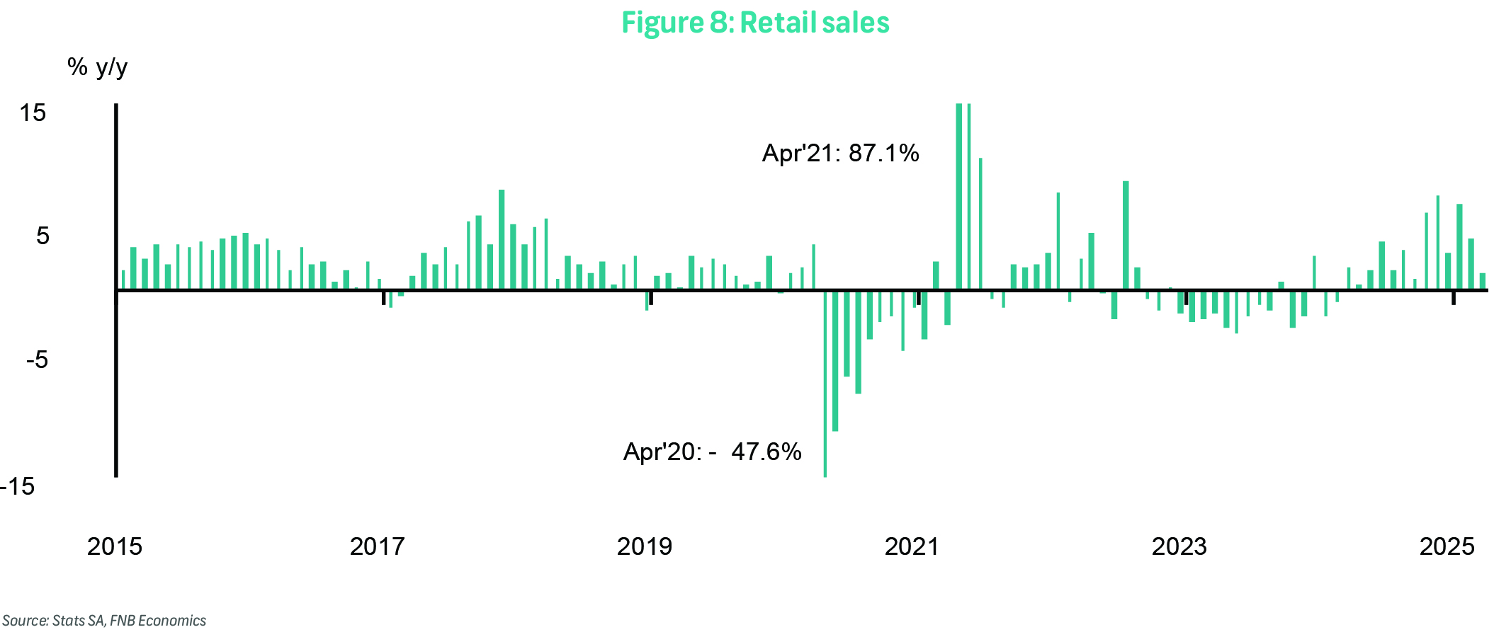 Also on Wednesday, retail sales data for April will be released. In March, volume sales rose by just 1.5% y/y, down from 4.1% in February. On a monthly basis, sales volumes dipped by 0.2%, following a steeper 1.2% drop in in the previous month, suggesting that household spending is losing momentum, which could weigh on broader economic growth. The slowdown was likely due to fading support from once-off large-scale two-pot pension withdrawals, as well as rising uncertainty both at home and abroad.