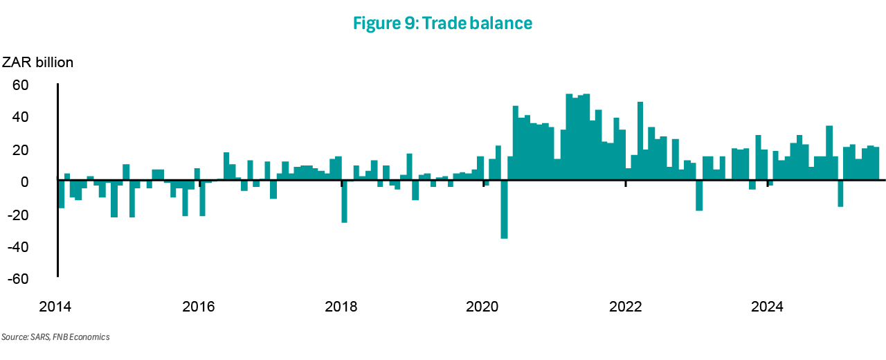 Last on Tuesday, the trade balance for August will be published. The trade balance recorded a R20.3 billion surplus in July, slightly lower than the R20.9 billion surplus in June. The July outcome reflected an 8.5% m/m increase in exports to R184.3 billion, while imports rose at a faster pace of 10.2% m/m to R164.0 billion, narrowing the surplus modestly. Year-to-date, the trade surplus stands at R98.9 billion, below the R113.7 billion recorded over the same period last year. This reflects exports rising 1.3% y/y year-to-date, while imports have edged down 0.1%.