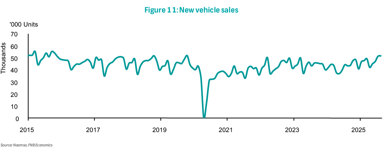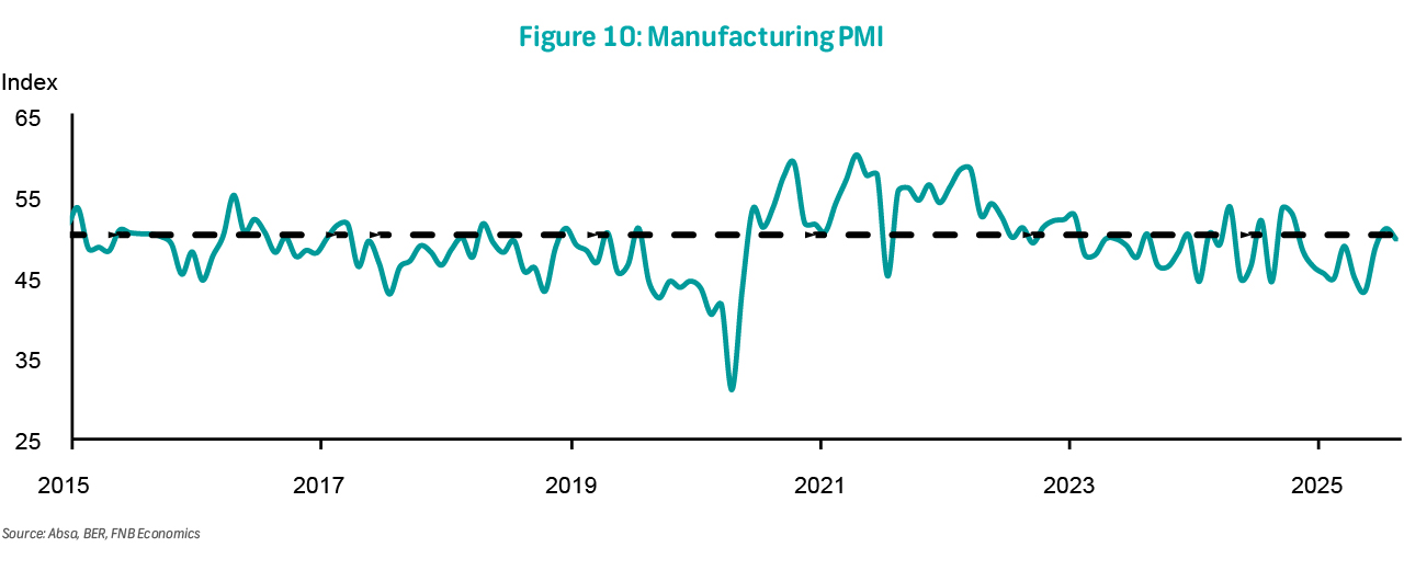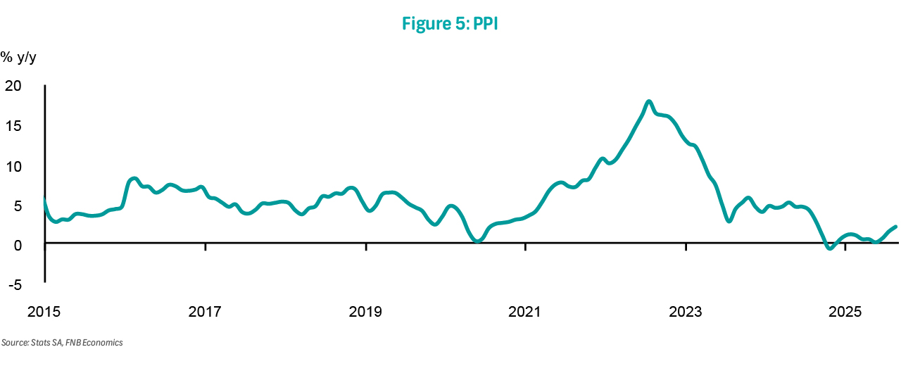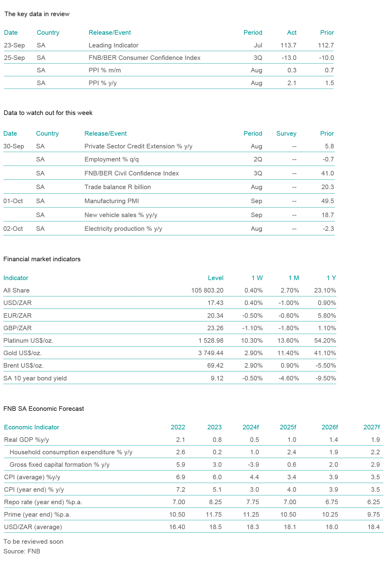 On Wednesday, the manufacturing PMI for September will be released. The PMI fell by 1.4 points to 49.5 in August, slipping back into contractionary territory and partially reversing July's brief expansion. Sector activity remained subdued, with both domestic and export demand under pressure. Supplier deliveries declined, likely due to weaker orders rather than logistical improvements. Input cost pressures eased slightly, supported by a stronger rand and stable oil prices. Encouragingly, expectations for near-term business conditions remained upbeat at 56.8. Notably, the average PMI for 3Q (with September pending) stands at 50.2, up from 45.4 in 2Q25.