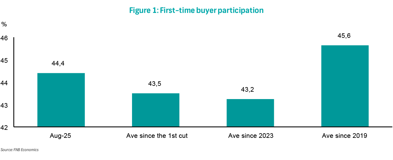 The recent interest rate cuts have begun to stimulate demand, particularly among first-time buyers, the most rate-sensitive segment. FNB's internal home loan application data shows that first-time buyers made up 44.4% of applications in August 2025, up from 43.5% since the first rate cut in 2H24 and the 43.2% post-pandemic average (2023 onward). While this marks a positive shift, participation remains below the long-term average of 45.6% seen since 2019. This suggests that while monetary easing has helped alleviate affordability pressures and encouraged re-entry into the market, structural challenges, such as income constraints and limited supply in entry-level segments, continue to temper the recovery.