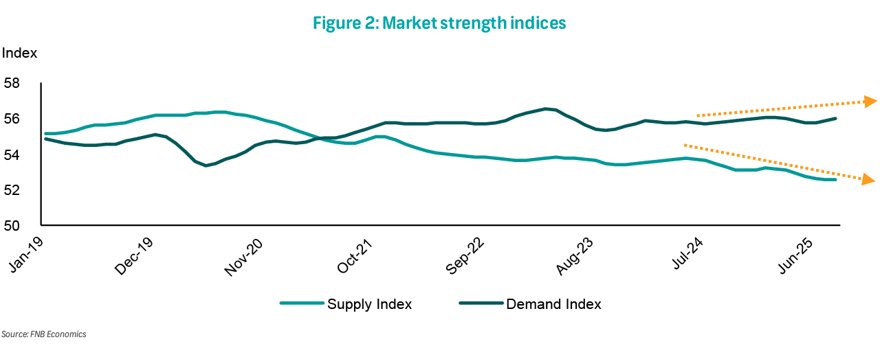 In contrast to the modest demand recovery, FNB's Market Strength Indicators, derived from property valuers' database, suggest that housing supply has declined more significantly. This means that developers and sellers are holding back, likely due to elevated construction costs, economic uncertainty, and unfavourable selling conditions. This has created a supply-driven price surge, with constrained inventory - rather than robust demand - being the primary driver of recent price growth.