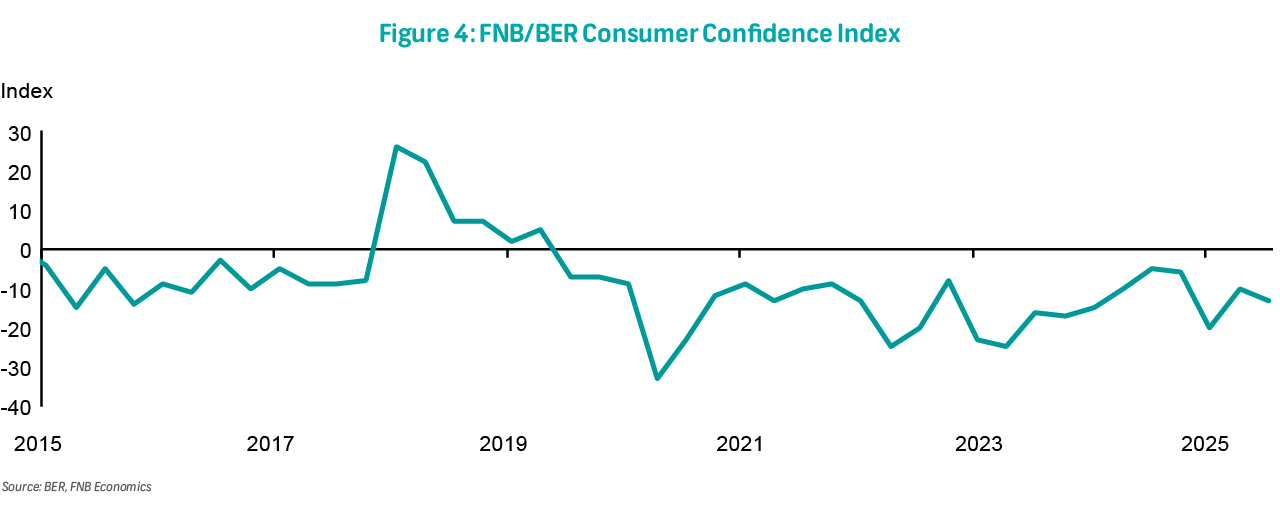 The FNB/BER Consumer Confidence Index (CCI) declined from -10 to -13 in 3Q25, indicating further weakening in consumer sentiment. This drop was driven primarily by a sharp deterioration in confidence among middle-income households (R5 000-R20 000/month), whose index fell from -7 to -16. While high-income households (above R20 000/month) remained steady at -11, and low-income households (below R5 000/month) showed a notable rebound from -15 to -9. Despite being an improvement from the exceptionally low -20 recorded in 1Q25, the current reading remains well below the historical average of -1 since 1994, suggesting a slowdown in real household consumption growth. The decline was mainly due to worsening perceptions of household finances and the economic outlook, although the time-to-buy-durable-goods sub-index slightly improved, supported by a 25-basis-point interest rate cut and a stronger rand.