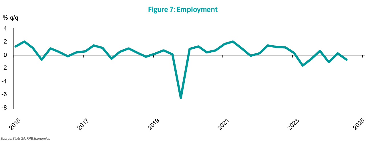 Also on Tuesday, the Quarterly Employment Statistics (QES) for 2Q25 will be released. The 1Q25 QES continued to show weak formal employment outcomes at the start of 2025. Although a seasonal dip in employment is typical following the festive season, the persistently low aggregate employment levels underscore an economy struggling to absorb its available workforce. Formal employment was down by 74 000 q/q (or 0.7%) and 95 000 y/y (0.9%) led by trade and community services. Earnings also declined by 4.6% q/q but are still 2.7% higher than a year ago and roughly in line with inflation. Compared to the start of 2020, over 270 000 jobs have been added – translating to 2.6% growth. Earnings, on the other hand, have grown by 32.5%. Therefore, while South Africa has had a persistent jobs crisis, incomes have fared more favourably.